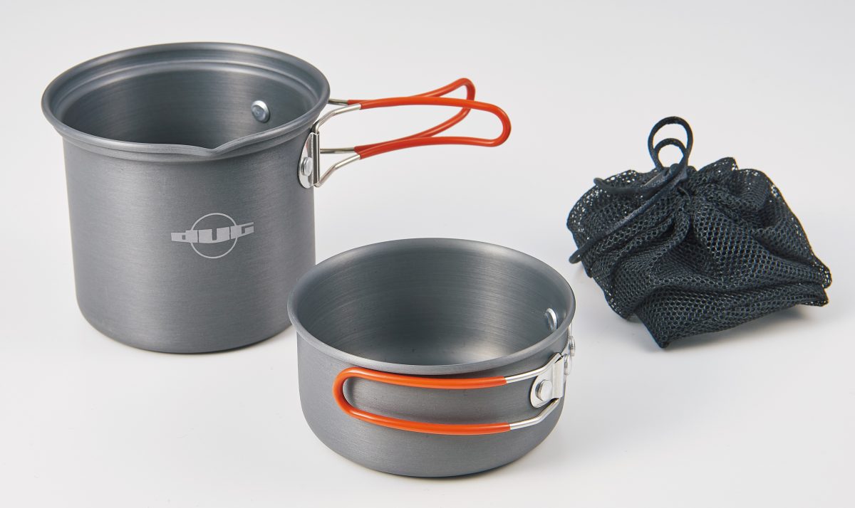 昔ながらのソロクッカー。0.55ℓと0.35ℓの大小セットで110のOD缶とバーナーを収納可能。大クッカーには注ぎ口があり、フリーズドライの袋に湯を注ぎやすい。小クッカーは深さがあり、炒め煮もしやすい。湯沸かしだけでなく調理もしたい人向け。