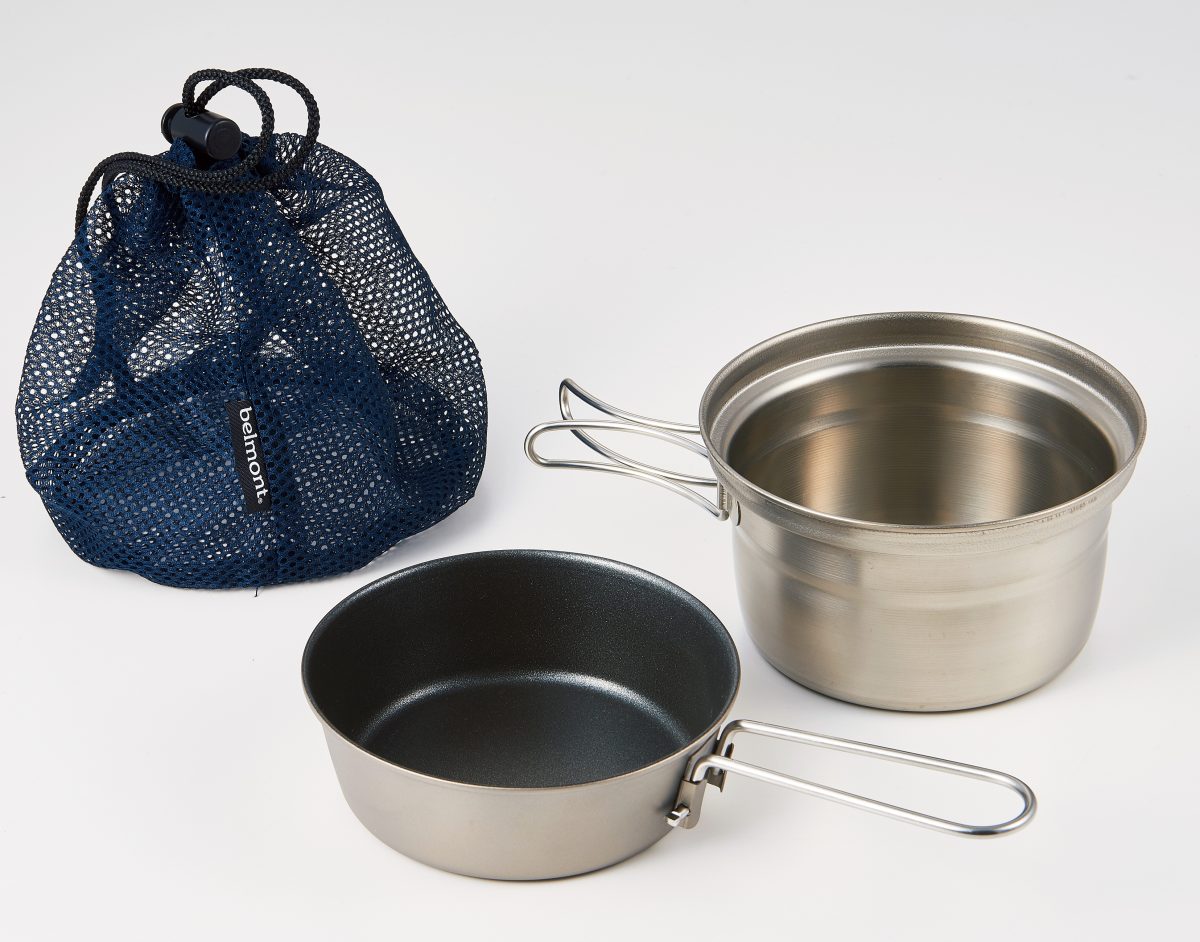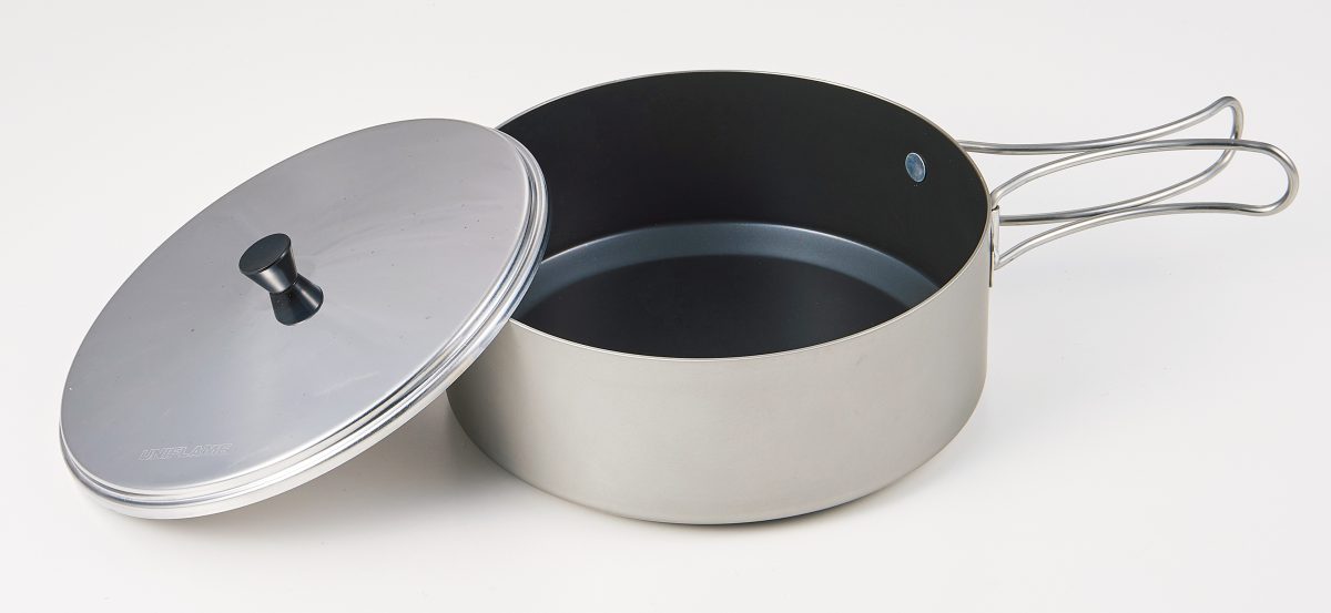 ヘラ絞り加工という底面から側面まで均一の厚さになるようにつくられたクッカーで、チタンの弱点である熱伝導率の低さを向上。フライパンにもなるフタは、内側にコゲ防止加工がされ、弱火で使えば玉子料理もコゲつかない。