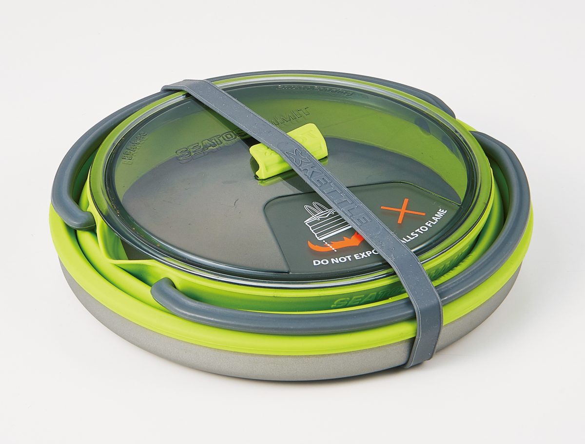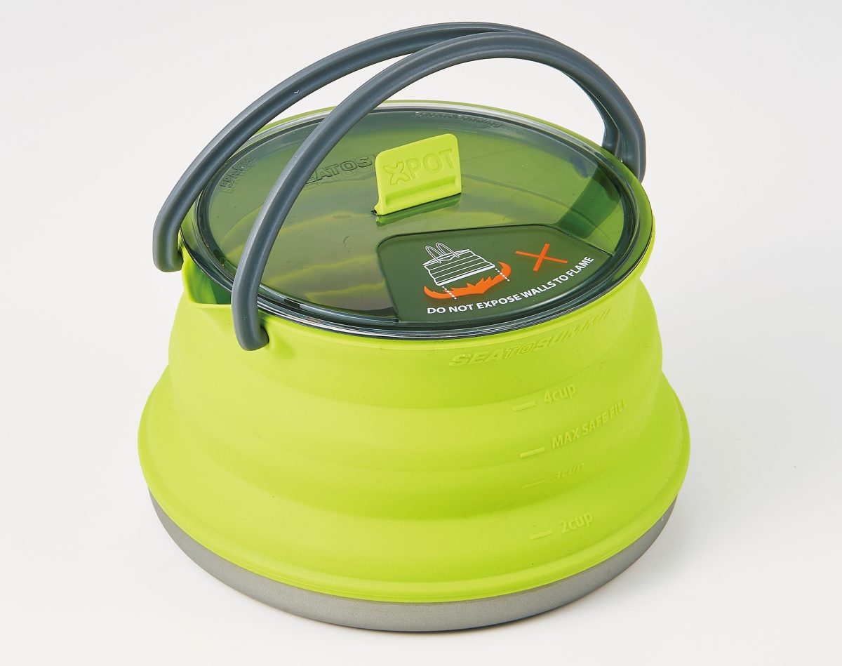 側面が耐熱シリコン製の蛇腹形状のため、ペタンとたたんで高さ3.5cmの薄さに収納可能。注ぎ口のついたケトルながら開口部が広いので、大きめのクッカーとしても使え、パスタを茹でる際には湯切りができ、ハンドルを開いてつつけば鍋料理もできる。