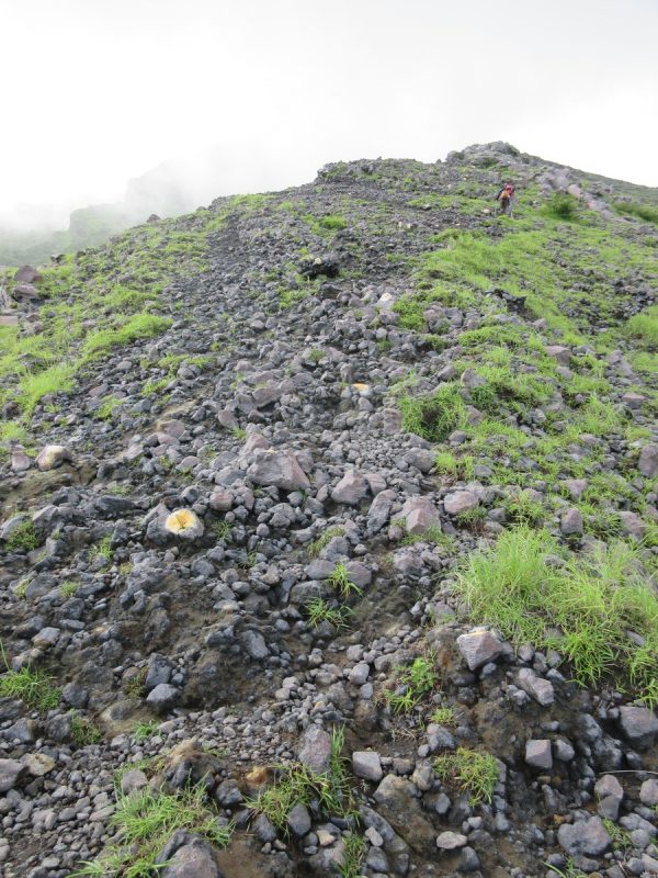 中岳山頂から先は火口東展望所へと続く登山道が正規ルートだが、火口1km圏内に入ってしまうため、この日は進むことができなかった。その場合は、中岳山頂手前から斜面を降りる、すずめ岩迂回ルートを使って下山する。正規ルートよりも距離は短くなるものの、滑りやすい岩場の急斜面が続く。