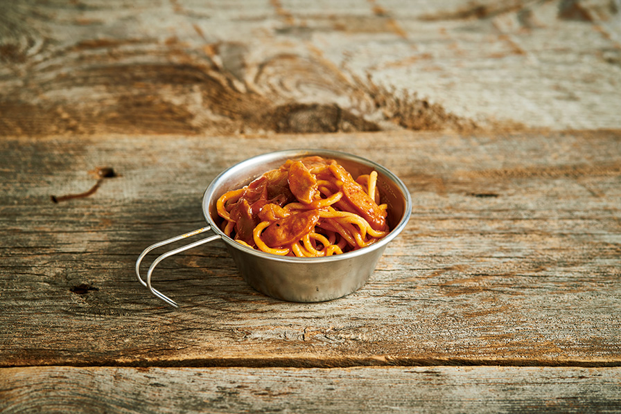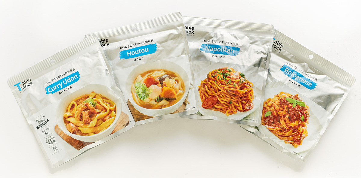 山頂やテント場での“ごほうび”となるのが、手軽に本格的なパスタや麺料理を楽しめるテーブルストックシリーズ。「フリーズドライ食品ではないですが、沸騰したお湯で3分温めるだけで食べられる保存食。少し重いけれど、そのぶん、おいしさとカロリーは抜群です」。常温で5年保存ができるためフードロスの削減にも貢献。登山などのアクティビティのお供はもちろん、災害時の非常食としてもストックしておきたい一品だ。
