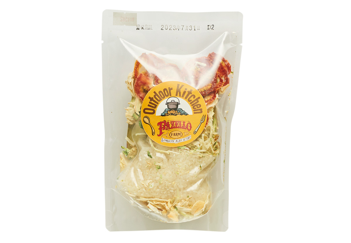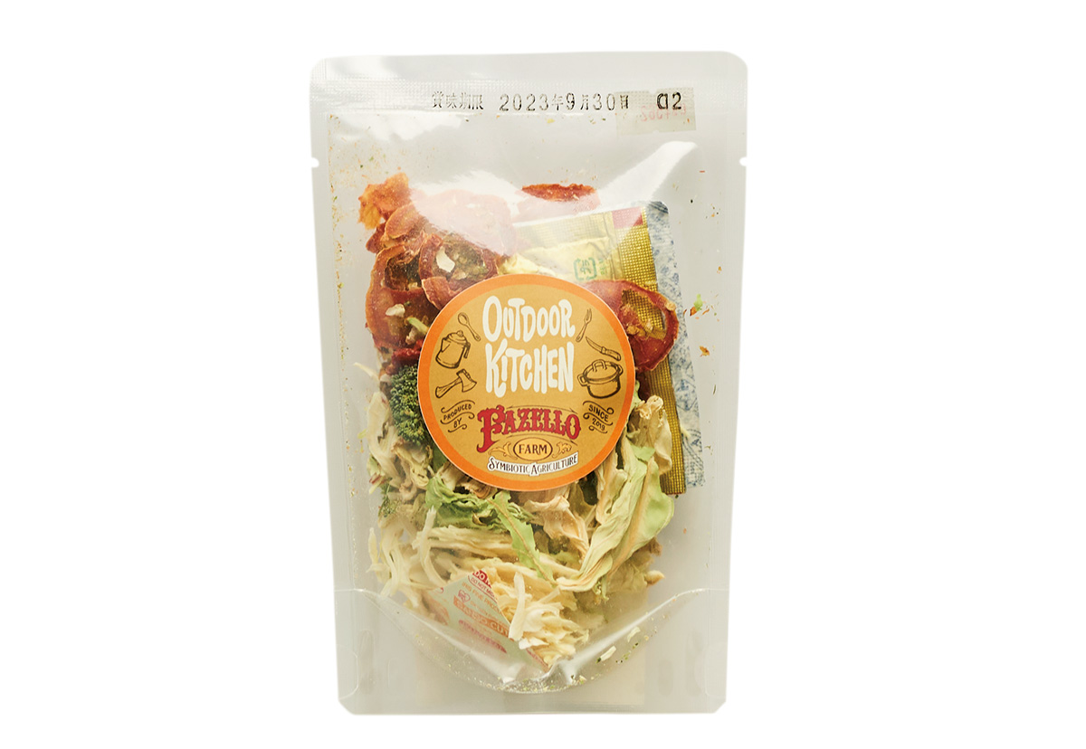 三浦半島の農園・ファゼーロファーム発のドライベジフードブランド『アウトドア キッチン』。キャンプやアウトドアを愛するオーナーが手がけるだけあって、その味わいと手軽さは本格的だ。「山のなかでも、クッカーに水と具材を入れて火にかけるだけで、フレッシュなイタリアンを食べられるのがうれしいポイント。塩やオリーブ油を加えれば、さらに風合いがアップ。ドライベジタブルやきのこの素材の香りや食感が楽しめます!」。