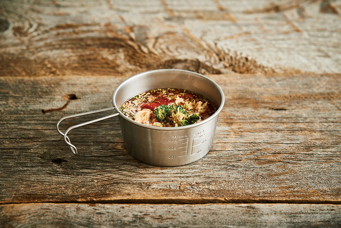 ブロッコリーやトマト、キャベツ、タマネギ、にんにくなどの野菜がたっぷり入った農園育ちのミネストローネ。「とにかく体が温まるし、チーズをプラスするなどアレンジが無限なところがいいですね」。チーズのほか、ベーコンやソーセージ、卵などを加えるのもおすすめだ。重量わずか27gと超軽量なことも魅力。バックパックに忍ばせておけば、テント泊の山行に+αのぬくもりと満足感を与えてくれること間違いなし!
