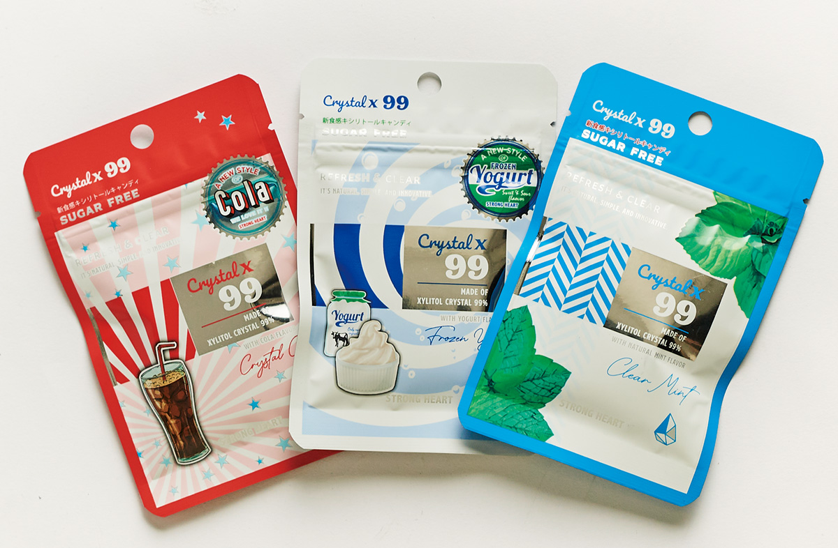 「行動中にちょっとした水分補給のような清涼感を味わえます。氷砂糖のようなお菓子で、口にみずみずしさが広がります。ちょうどいい甘さが疲労回復にも」と教えてくれたのがクリスタルX99。原材料の99%が、フィンランドのシラカバの樹液から抽出したキシリトールで構成された新感覚のキャンディだ。キシリトールに少量のオーガニック香料などを加えただけのシンプルなお菓子だが、ひんやりシャリシャリ食感がクセになる。