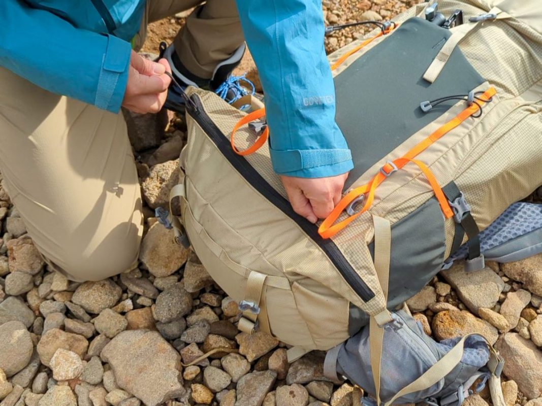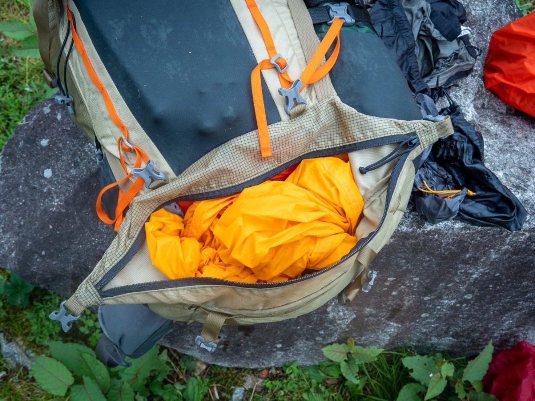 一方、ブリッジャーならば、テント内で上部荷室のパッキングを済ませ、外に出てテントを撤収したら、たたむ必要も収納袋に入れる必要もなく、そのまま下部荷室に押し込んじゃえばいいのです。ついでにレインウエアやパックカバーなどの濡れ物も隙間に詰めて、ファスナーをビッと閉めれば出発OK。次のテント場まで中をあさる必要もない。なんてノーストレスなんだ!!