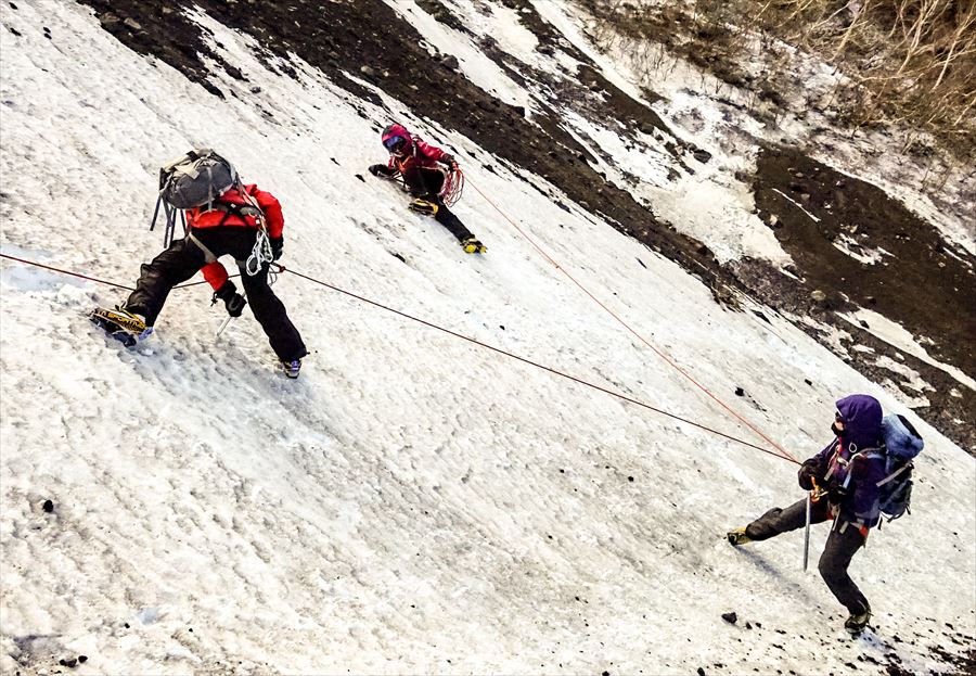 初冬や残雪期に、雪の急斜面を使ったピッケルやアイゼン、ロープワークなどのトレーニングを行なう。