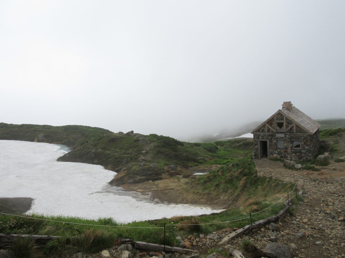 中岳分岐から枝尾根へ入り、よく整備された登山道をしばらく西へ下る。いったん東へ折り返すと、眼下に温泉場が見えてくる。登山道沿いの岩場に忽然と湧くワイルドな野湯、中岳温泉だ。そっと手を浸すと、かなり熱い。近くの雪渓の雪を拝借し、温度を調節する。うーん、心地よい。登山者だけに開かれた天然温泉、足湯だけでもいいのでぜひ浸かりたい。