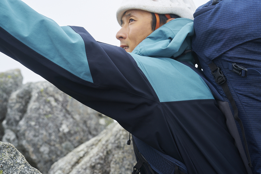 身ごろや背面、脇部分など発汗しやすい部分には耐水圧30,000㎜、透湿性40,000g/㎡/24h、そして通常のティフォン素材より耐久性を向上させた「ティフォンタフⅡ」素材を採用。水色の生地にあたるフード、肩、腕、腰まわりの生地はさらに耐久性が高く、耐水圧30,000㎜、透湿性20,000g/㎡/24hの補強生地を当てている。