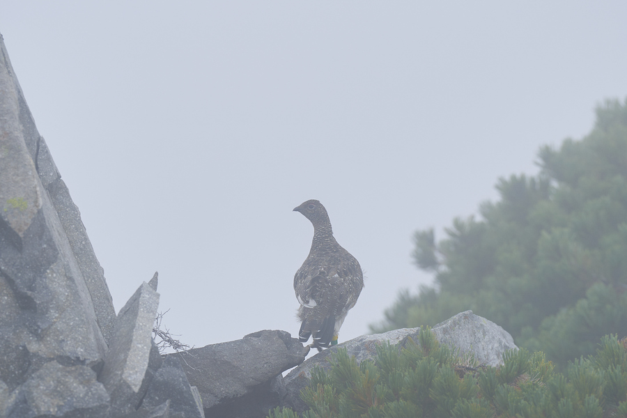 ガスに覆われたハイマツのなかからひょっこりとライチョウが姿を見せた。