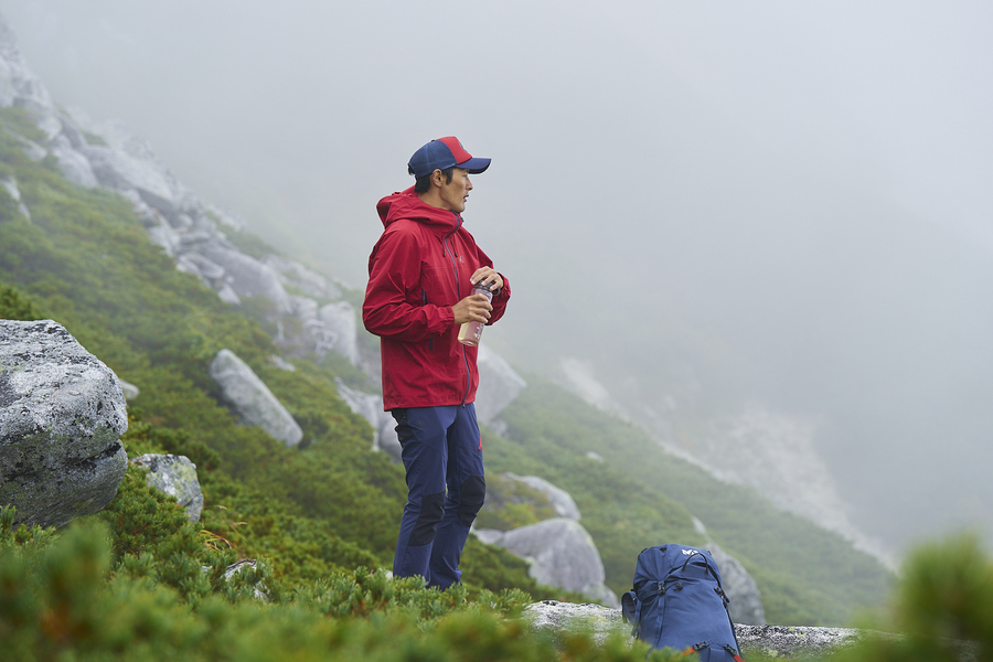 レインウエアなのでもちろん耐水性はバッチリ。耐水圧20,000㎜以上のため激しい風雨でも雨の浸入を防いでくれる。耐久撥水加工も施されているためタフに扱えるのもポイントだ。