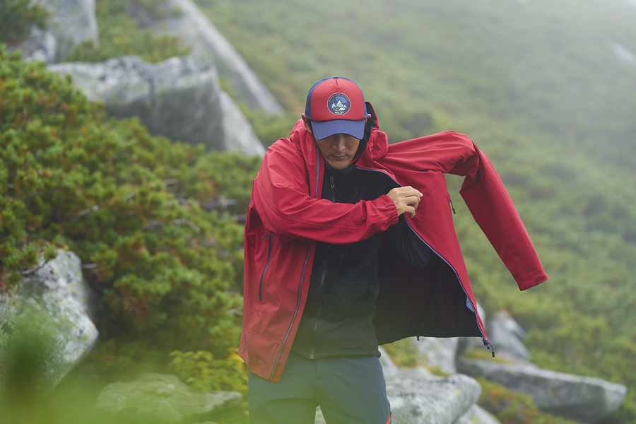 登りはじめに「ティフォン 50000 ストレッチ ジャケット」から着用してもらった。ときおり陽射しは差すものの、小雨がぱらついたり止んだり、まさに‟ティフォン日和”な天気。