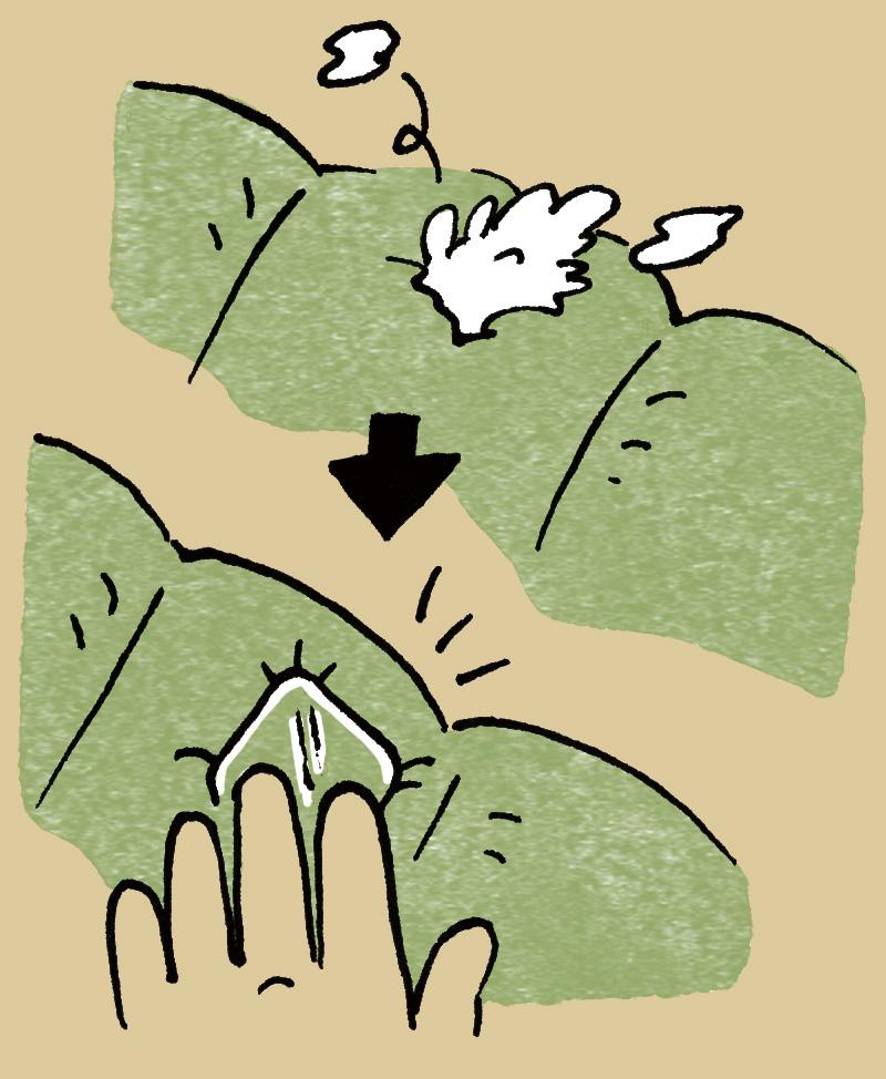 なお、穴が空いていなくてもダウンが生地から出ている場合は、抜くのでなく内側に引っ張って戻してあげるようにすると良い。