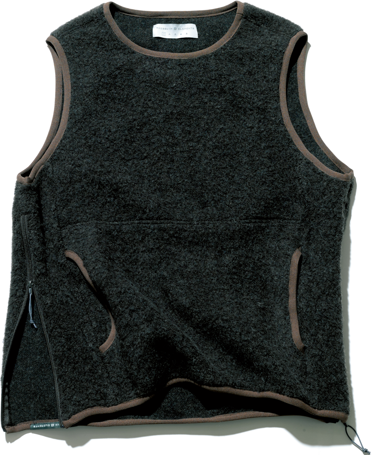 暖かくて軽く、肌触りのいいウール混素材のベスト。通気性が高いニット素材は着っぱなしでもオーバーヒートしにくく、汗を積極的に吸収・放出してくれるので、温度調節のコントロールが難しい秋冬の山行でも快適にすごせる。日常のコーディネートにも取り入れたくなるデザインなのに、山でしっかり使える機能を持った便利なアイテム。