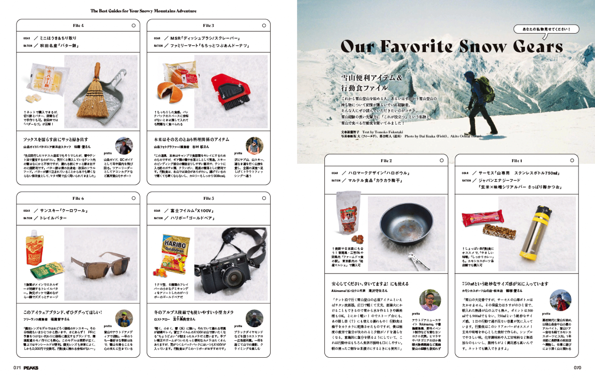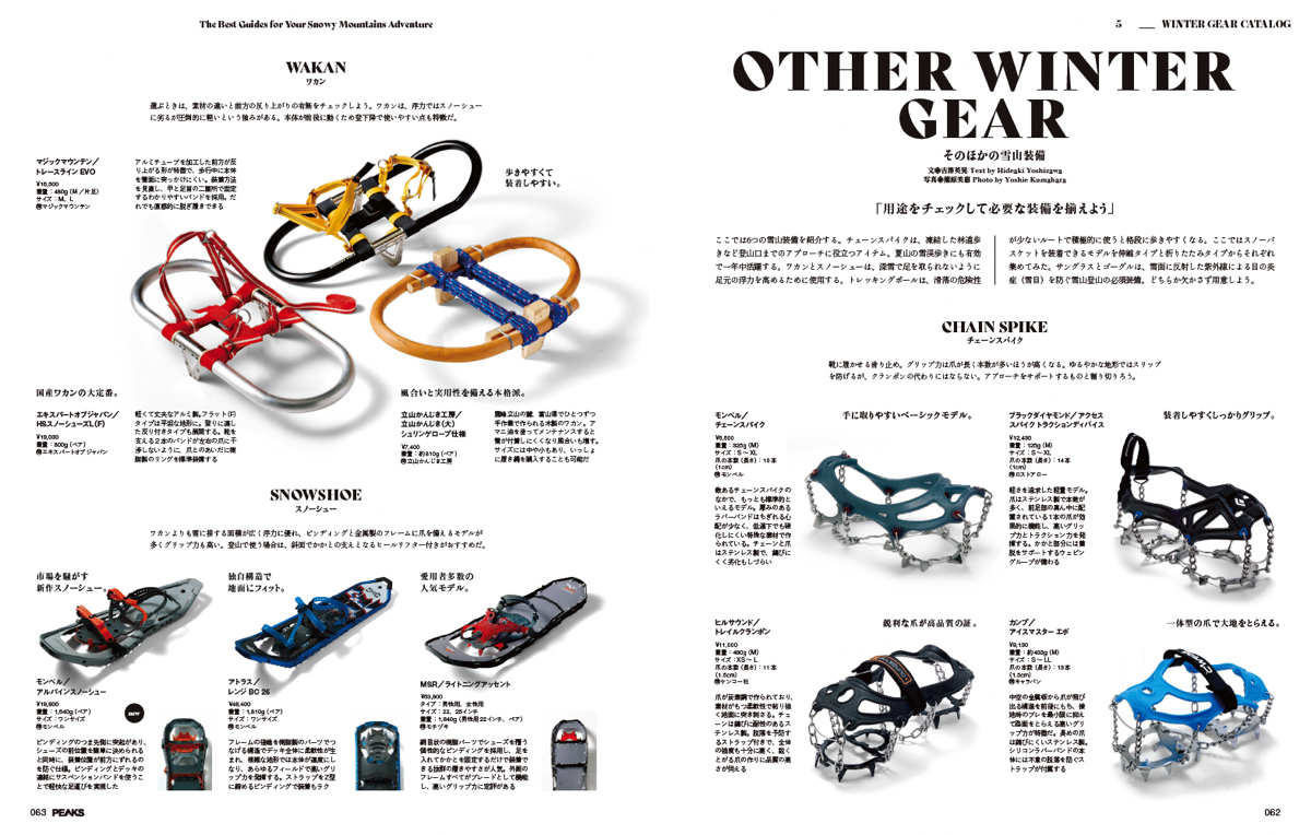 それらをはじめ、シューズやバックパック、サングラスやアバランチセーフティギアなど、雪山登山やスノーハイキングに使えるウインターギアもふんだんに掲載していますよ。