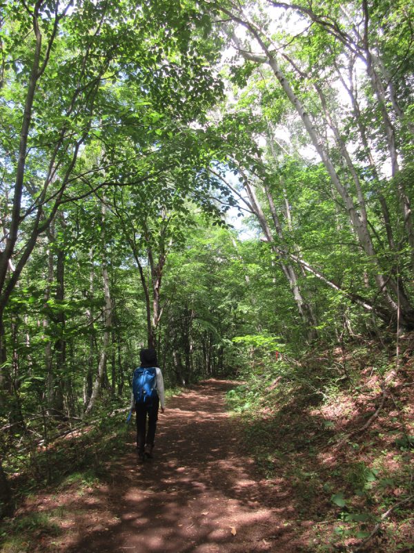 山頂でランチをとり、しばし休憩。その後は来た道を戻り、菅平への分岐を中四阿方面へ。信州の山々を遠くに見ながらのんびり進めば、道はやがて樹林帯へと入っていく。急な斜面や木の根が絡んだ少々歩きづらい区間もあるが、それも小四阿を越えたあたりまで。その先は爽やかな高原エリアの散策となる。