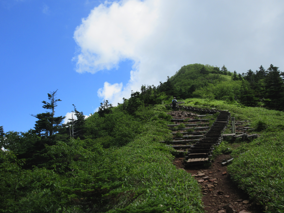 山頂手前の斜面には木段が設置されている。ここを登り、ちょっとした岩場を越えると、四阿山の山頂だ。