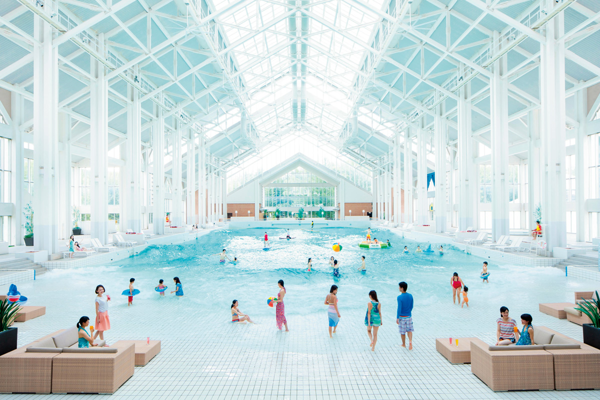ガラス張りの館内にあるのが約30℃の夏の気温と波の音。日本最大級の造波プールやこどもプールを備え、水着などのレンタルも充実。吹雪で滑れないときは常夏のプールへダイブしてもいい。