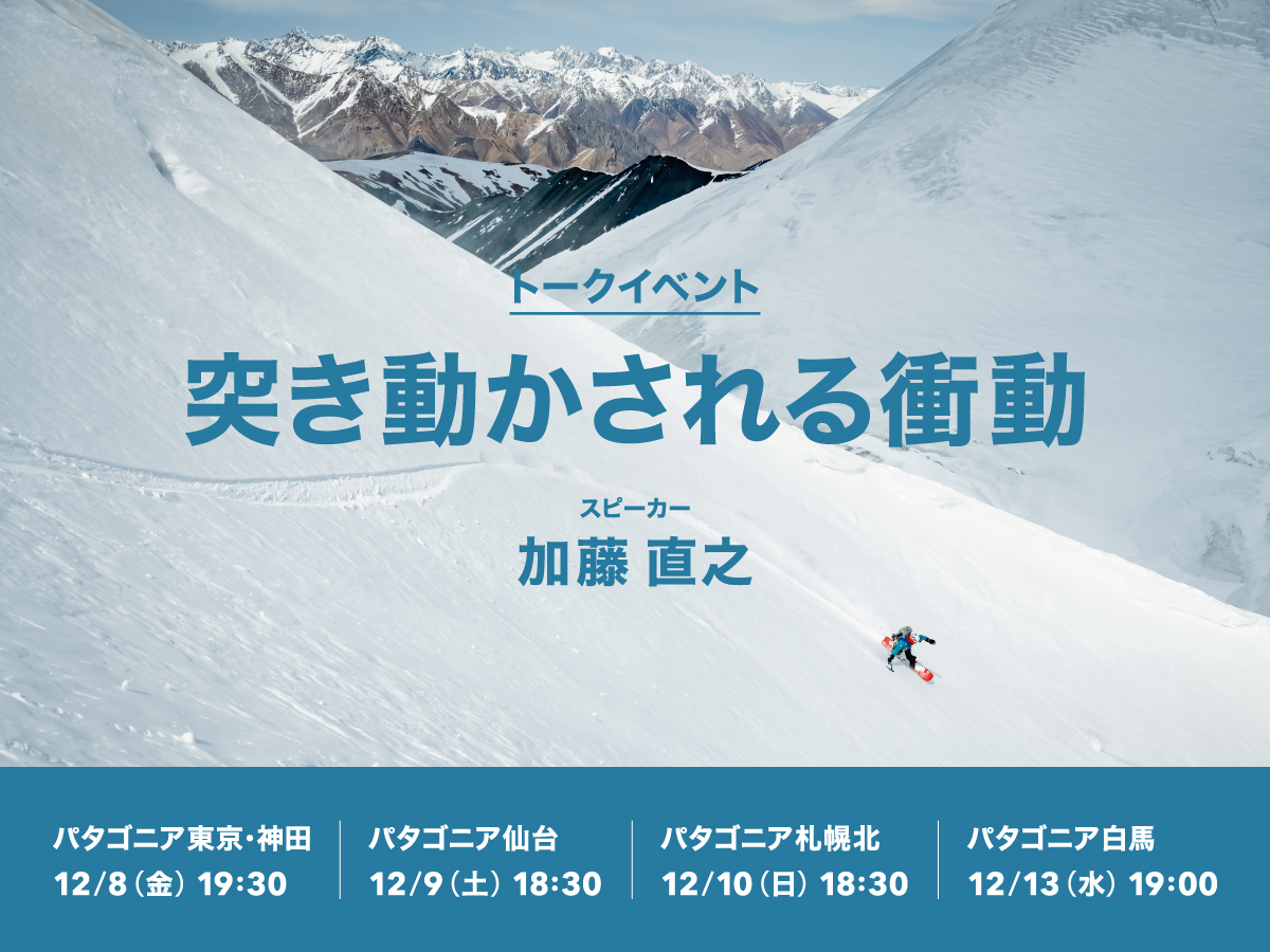 キャンペーンに伴い、今年の冬もパタゴニアではさまざまなスノーにまつわるイベントが各地で予定されており、そのイベント第一弾としてトークイベントが開催。パタゴニア・スノーボード・アンバサダーの加藤直之さんがゲストに登場し、スライド&トークイベントをパタゴニア直営店で行ないます。