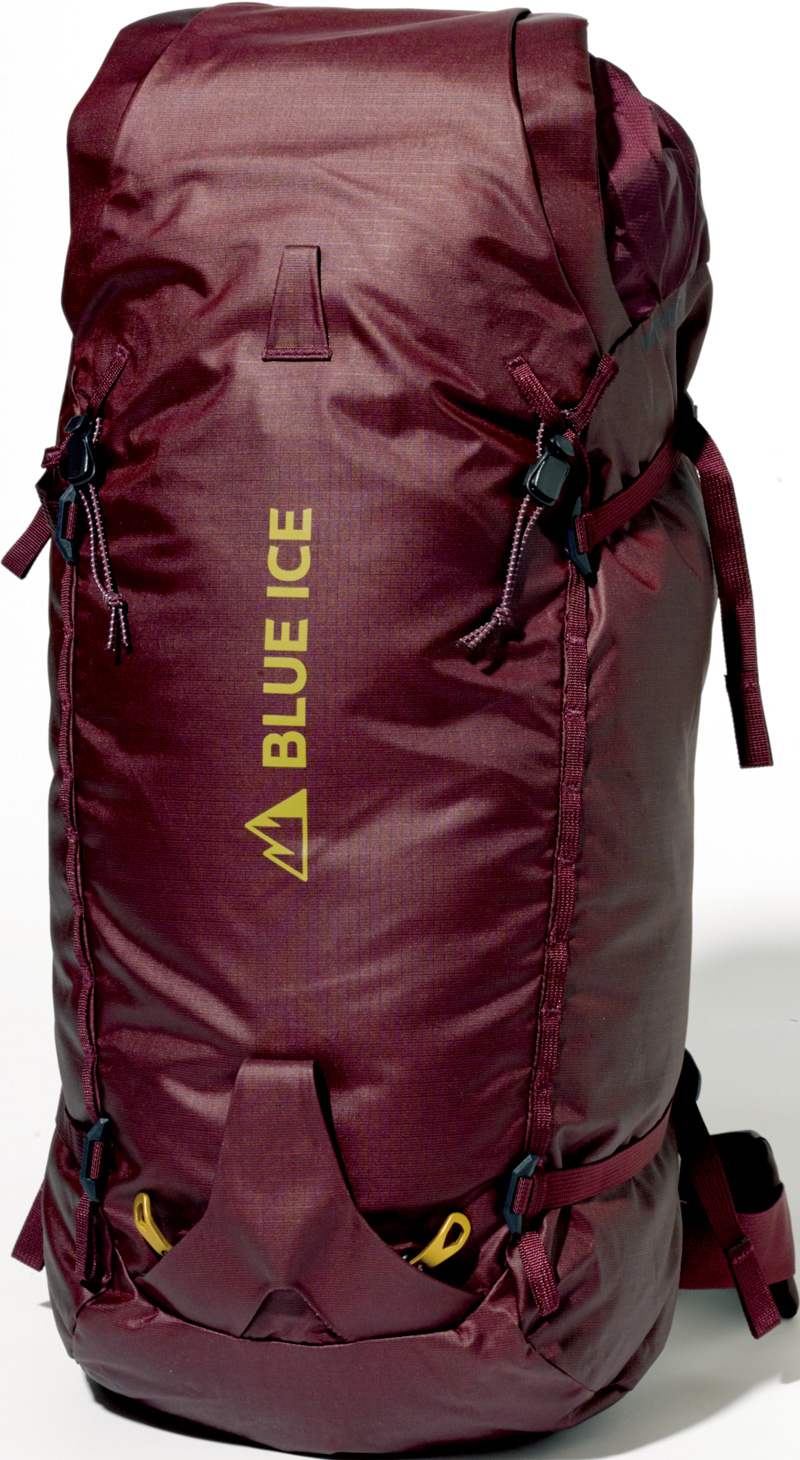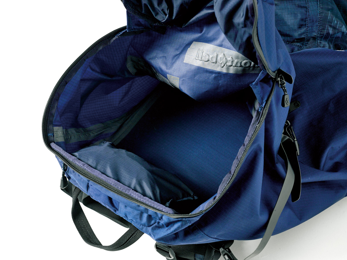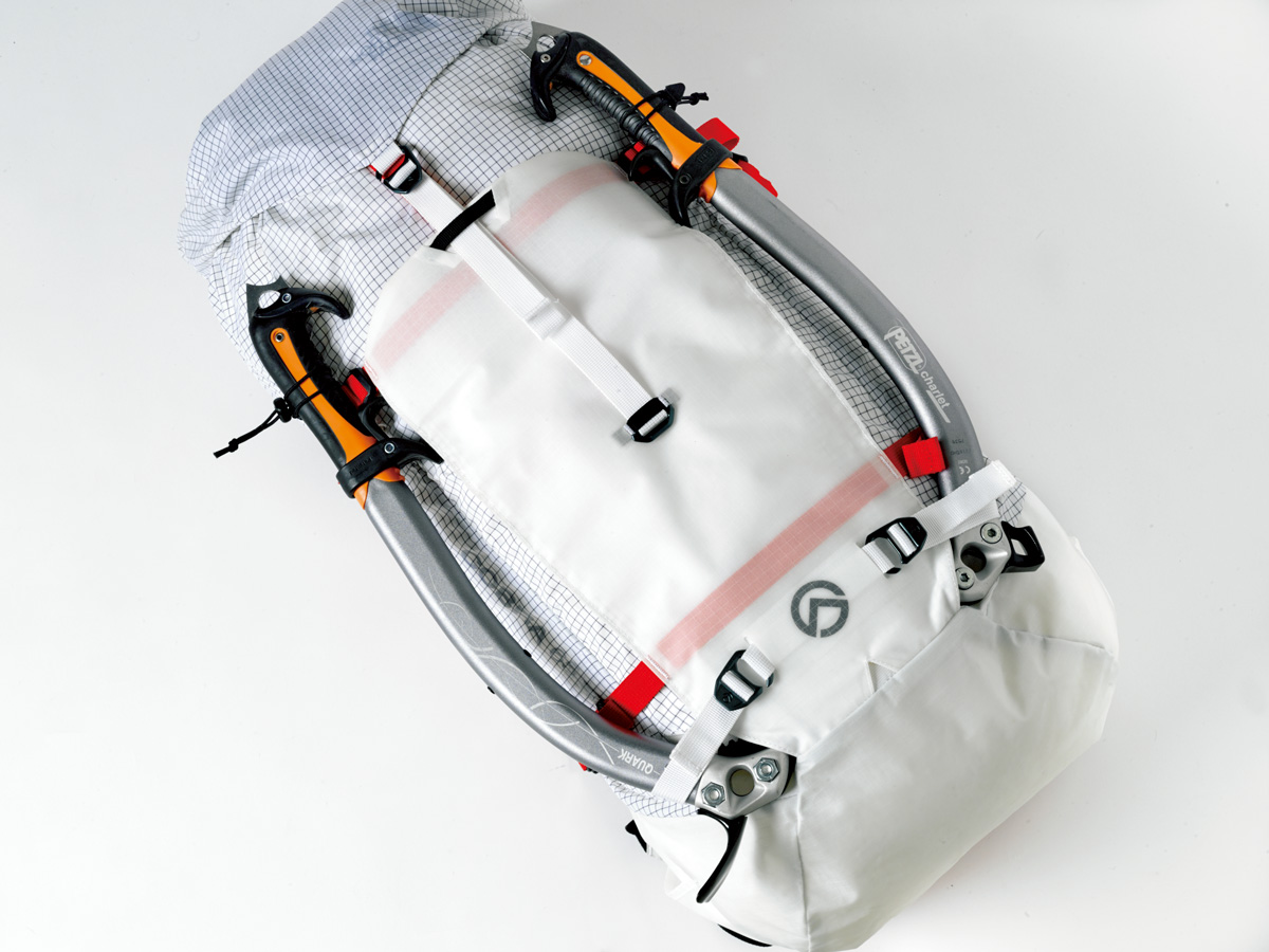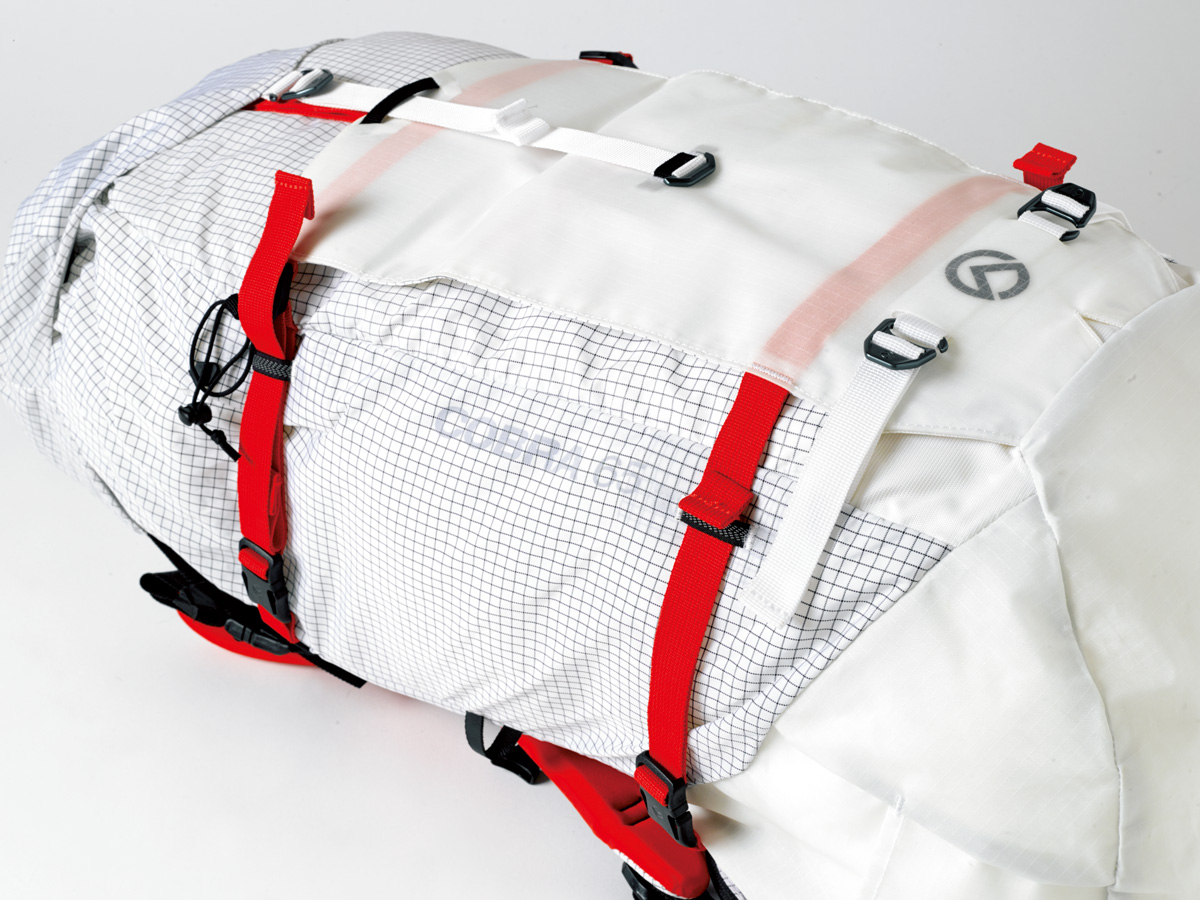 雨蓋やサイドポケットを排除した1気室で、ウエストベルトはクライミングハーネス装着を考慮して簡易的なストラップのみの、ミニマルでシンプルなデザイン。軽量ながら高い耐摩耗性を両立した独自開発のナイロン生地を採用し、過酷な山岳環境に対応。