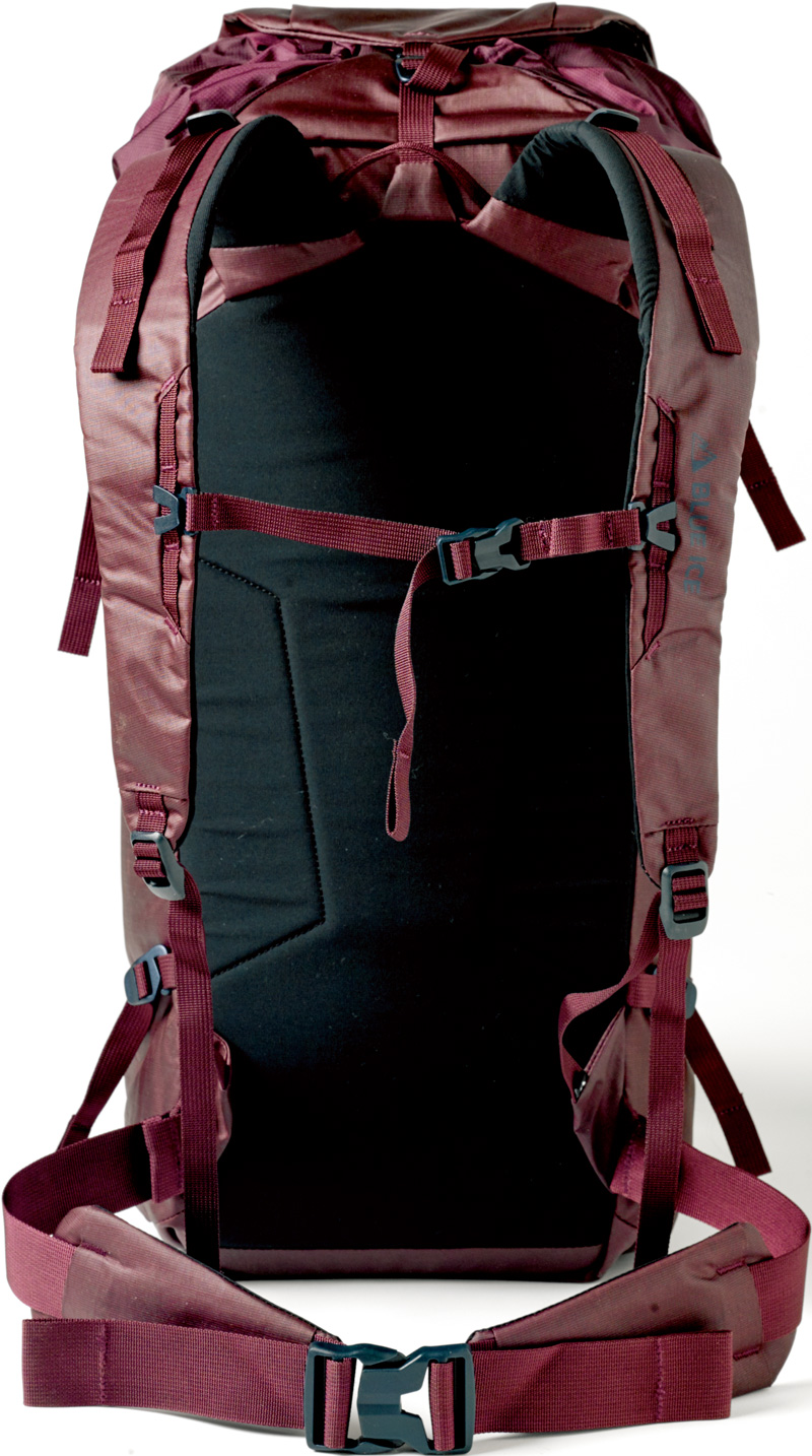 クッション性のあるEVA素材を内蔵した背面パッドの表地には雪が付きにくい素材を採用。アイスアックス取り付けシステム、ウエストハーネスのギアループ、ロープキャリーなどの収納だけでなく、グローブのままでも操作しやすいバックルなども装備。