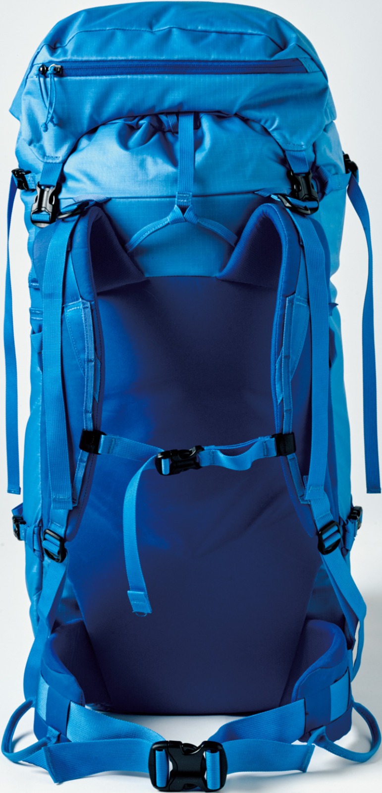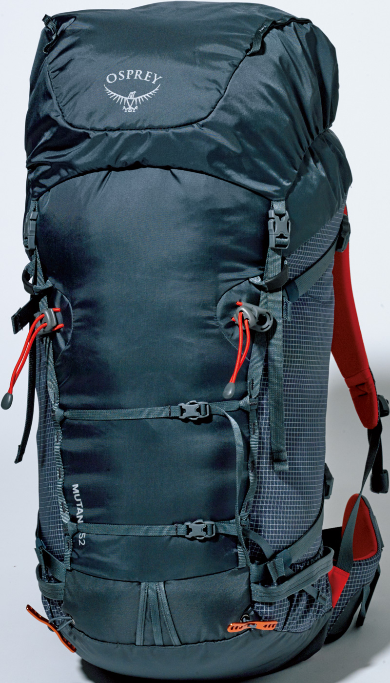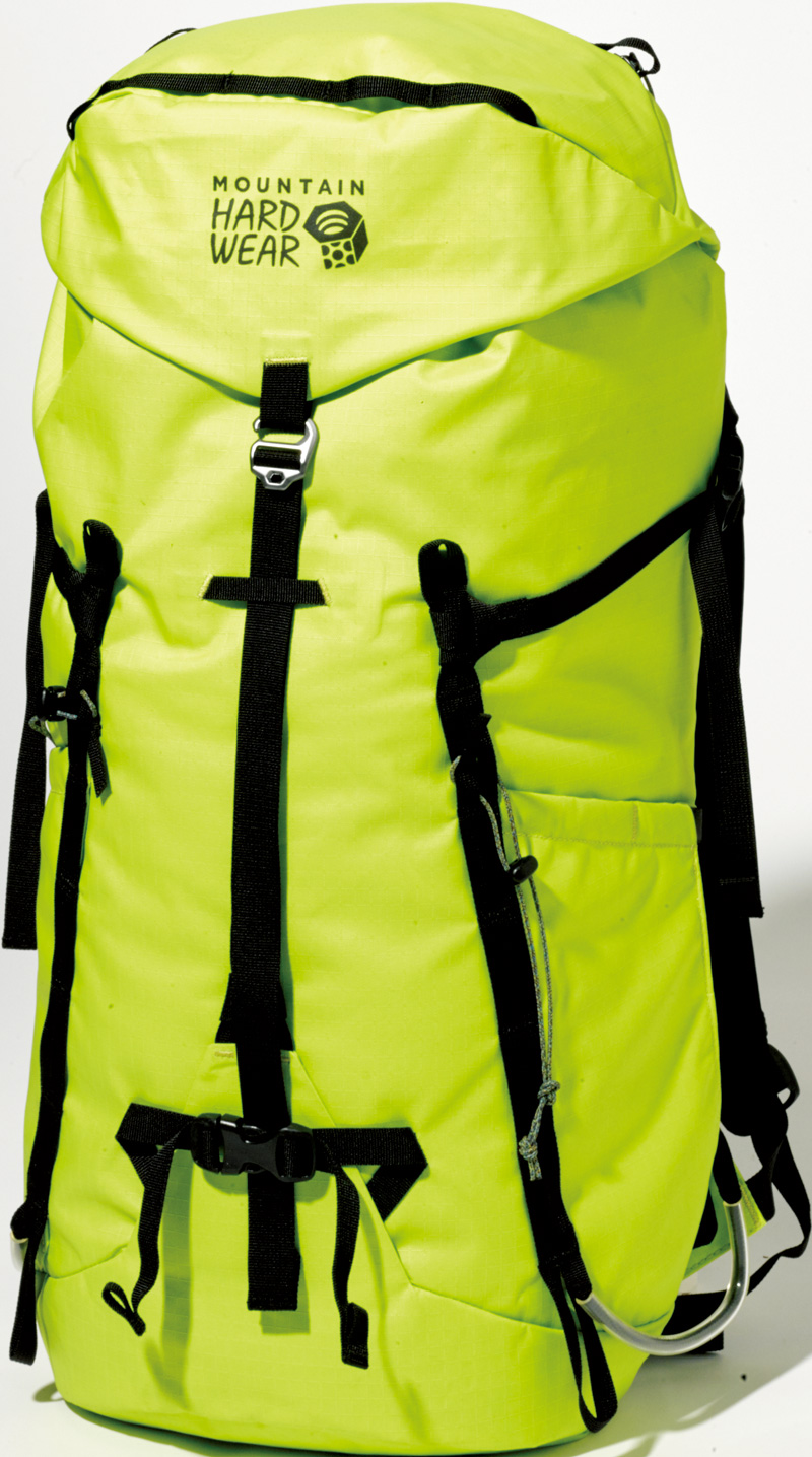サイドポケットもないシンプルなデザインに、420デニールのリップストップナイロンを採用することで、大型サイズとは思えない軽さを実現。背面システムの2本のアルミステーが背負い心地を安定させ、アイスアックスなどのギアを運ぶ機能も充実。