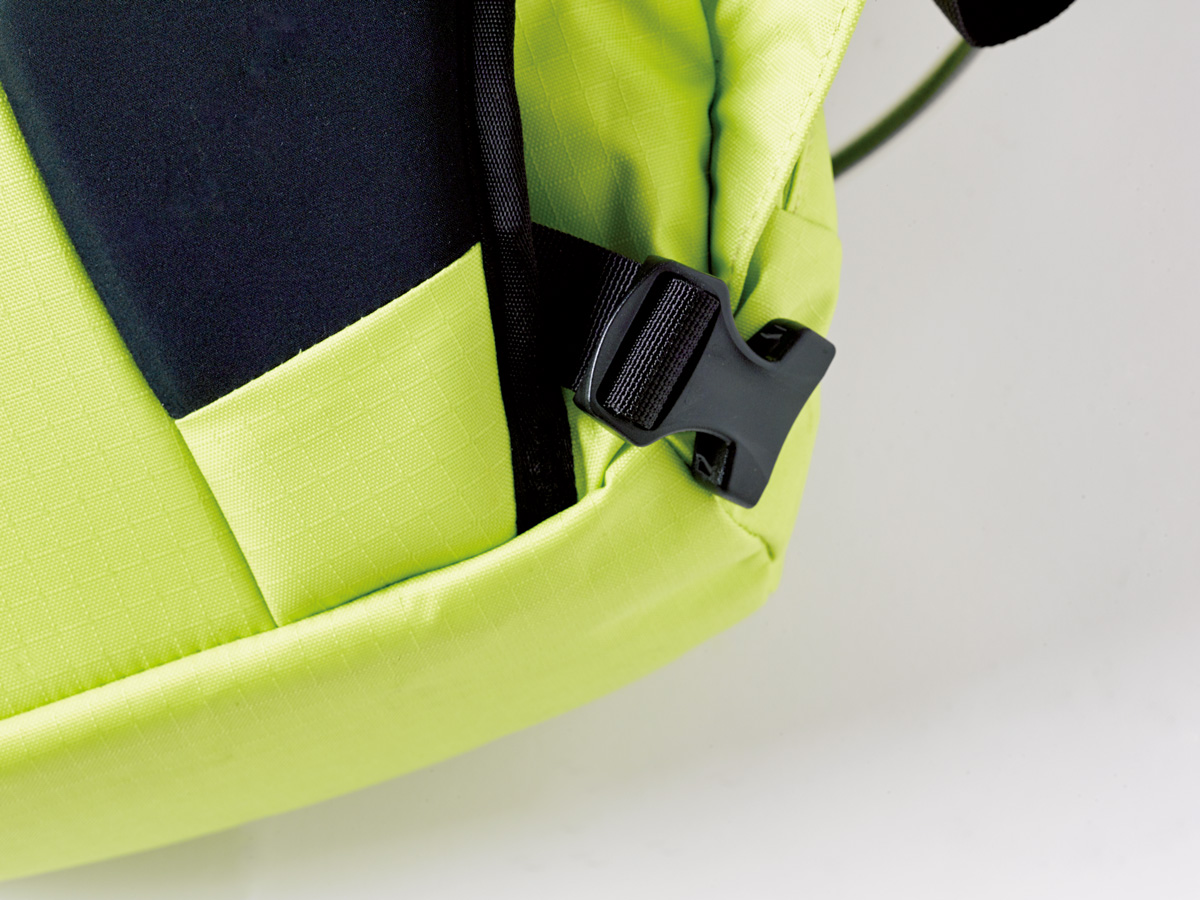 タフなシーンでも安心して活用できるように、本体生地にはTPUコーティングを裏面に施した400デニールのナイロンリップストップを採用し、耐久性と耐水性を両立。両サイドのボトルポケット、ギアループなどの便利な機能も装備している。