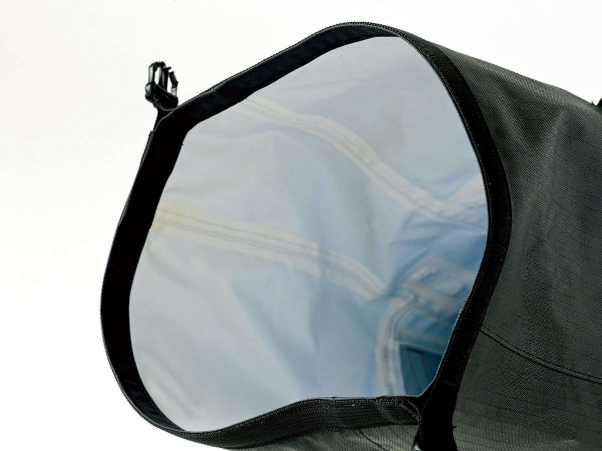 軽さと高い耐久性をもつ200デニールのリップストップナイロン生地を採用。開口部はロールトップ型で拡張性が高く、サイドアクセスファスナーがあるため本体内部にもダイレクトにアクセスできる。マチ付きフロントポケットは、小物の収納に便利。