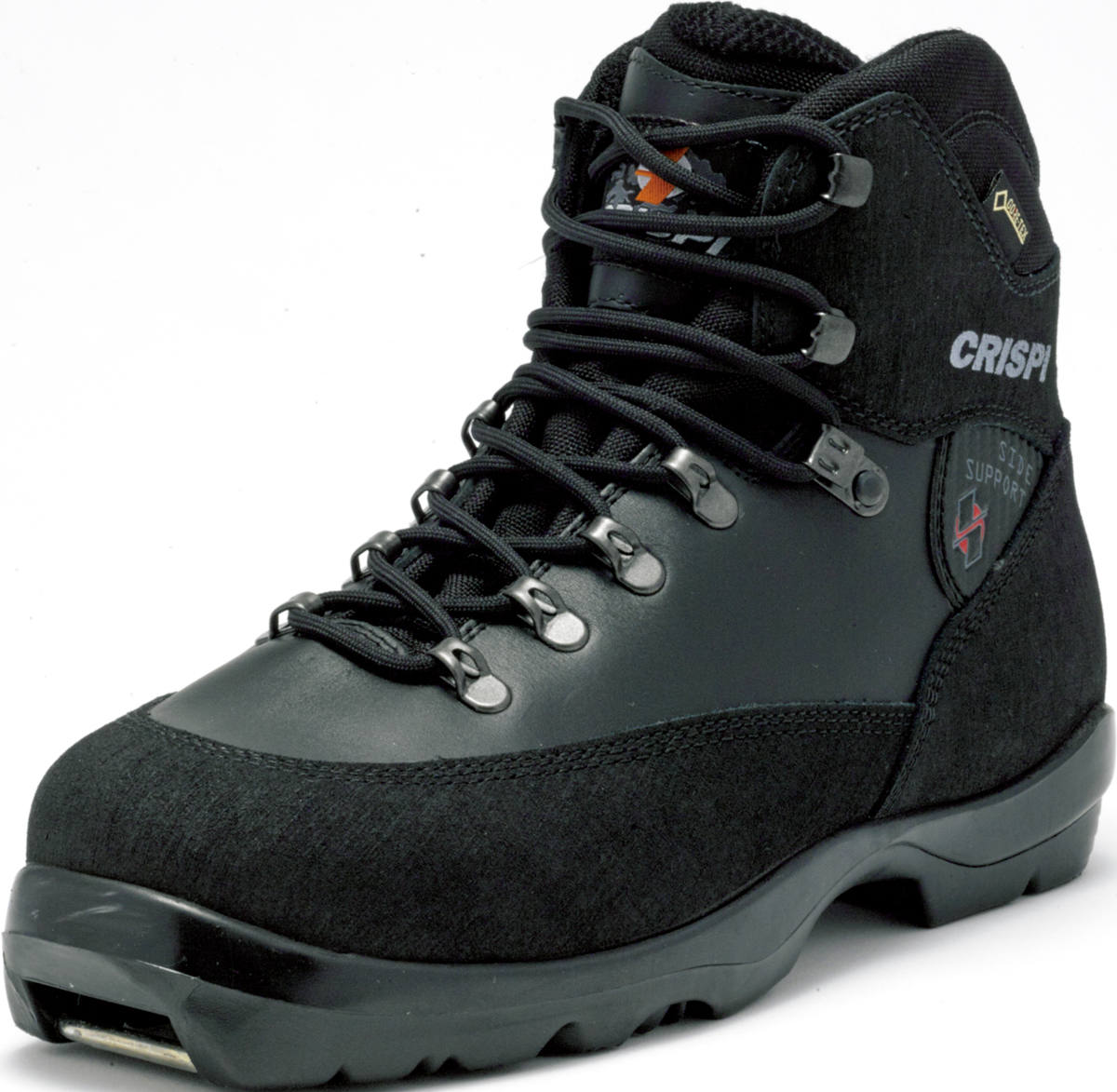 歩きやすさを重視するクロスカントリースキーのブーツは柔らかく軽量で、見た目は登山靴に近い。なかでも競技用のモデルはフィット感と軽さを重視したつくり。フィールド用のものはアッパーにゴアテックスなどを使い、防水性を高めてある。つま先にはビンディングに噛ませるバーが付いている。
