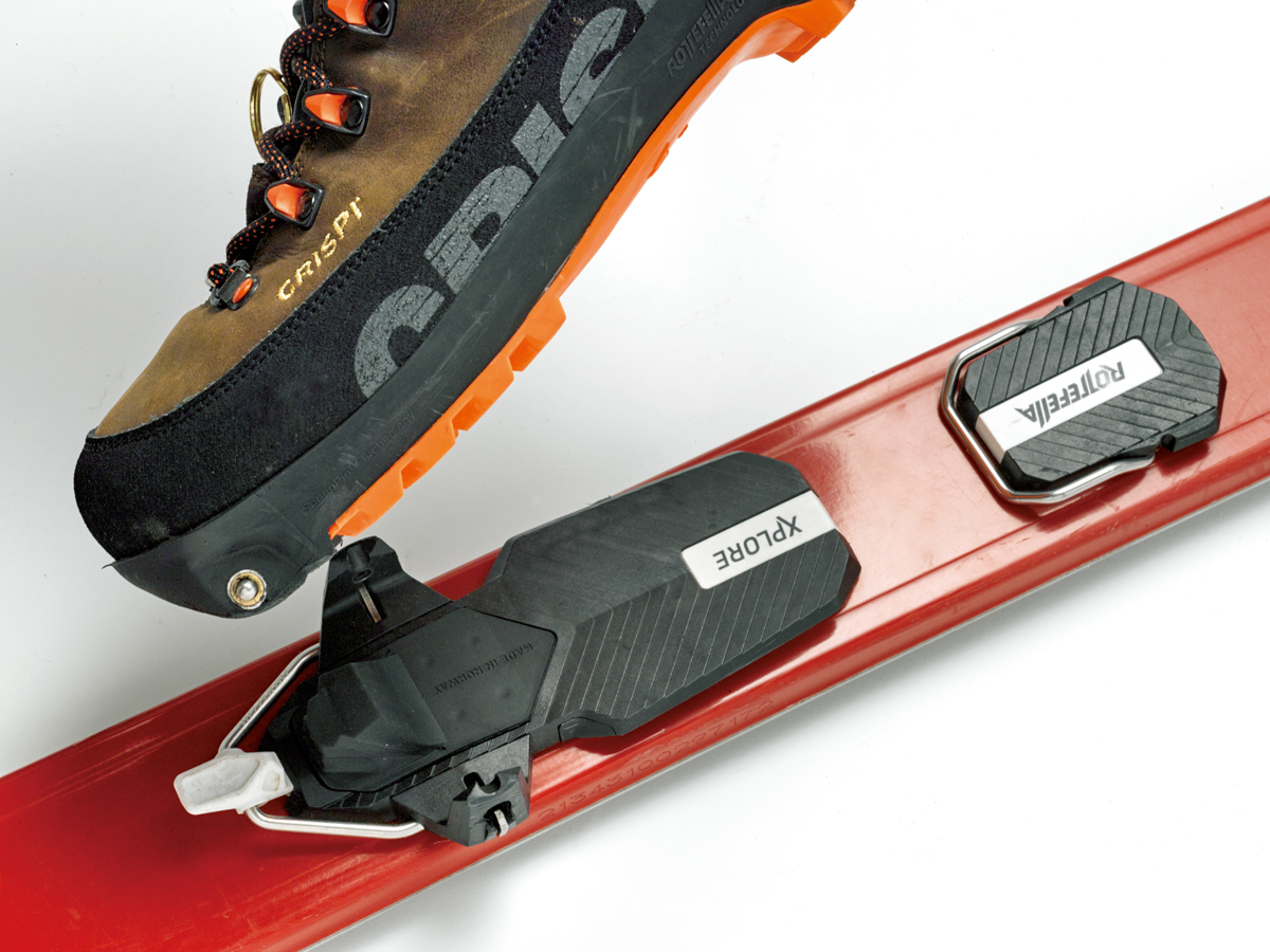 ビンディングはブーツ先端のバーを掴む仕組み。固定するのはつま先のみで、カカトは自由に上がるので歩きやすい。主流は2種類で、ひとつは整備されたトラックや、それに近い緩やかな地形を想定したもの。もうひとつは滑ることも想定し、幅を広くして安定感を高めたタイプ。