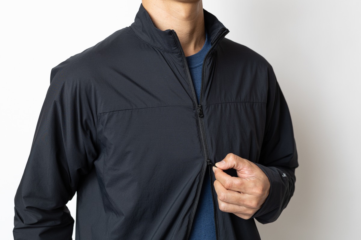 まず、なんといってもサッと羽織るだけのシンプルさがいい。袖口の面ファスナーや裾のドローコードのフィット感を調整しなくて済むのが、こんなにも楽なことだと気付かされたジャケットだ。ポケットなどもないシンプルなデザインのため、アウターシェルと組み合わせてレイヤリングするときでも、着膨れによる動きにくさやストレスはない。