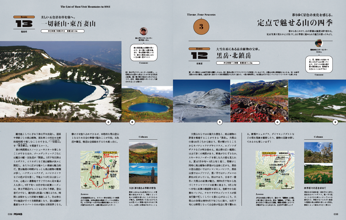 景色やアスレチック感覚で岩場を楽しめるものだけでなく、ビジターセンターなどの施設協力のもと、四季を通じた魅力や、山中で見られる花、残雪時期におすすめの山など、幅広いバリエーションでルートと見どころをご紹介しています。
