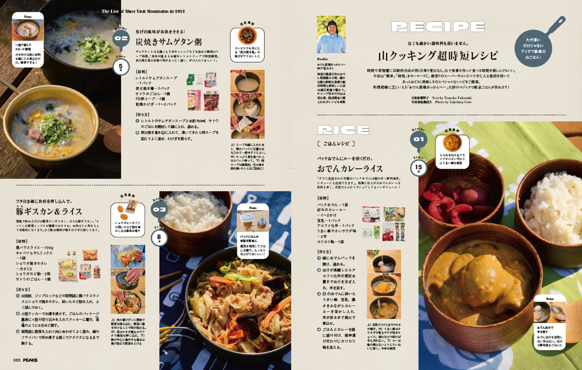 時間や荷物量に比較的自由が利く日帰り登山なら、山で食事を作って食べる時間を楽しむことも提案したい。 そんな思いから「簡単」「時短」をキーワードに、最寄りのスーパーやコンビニで手に入る食材を用いて、美味しいスペシャルレシピも掲載します。