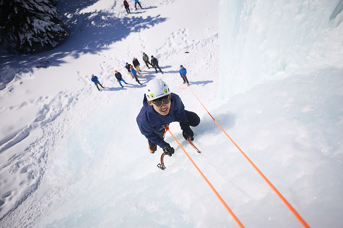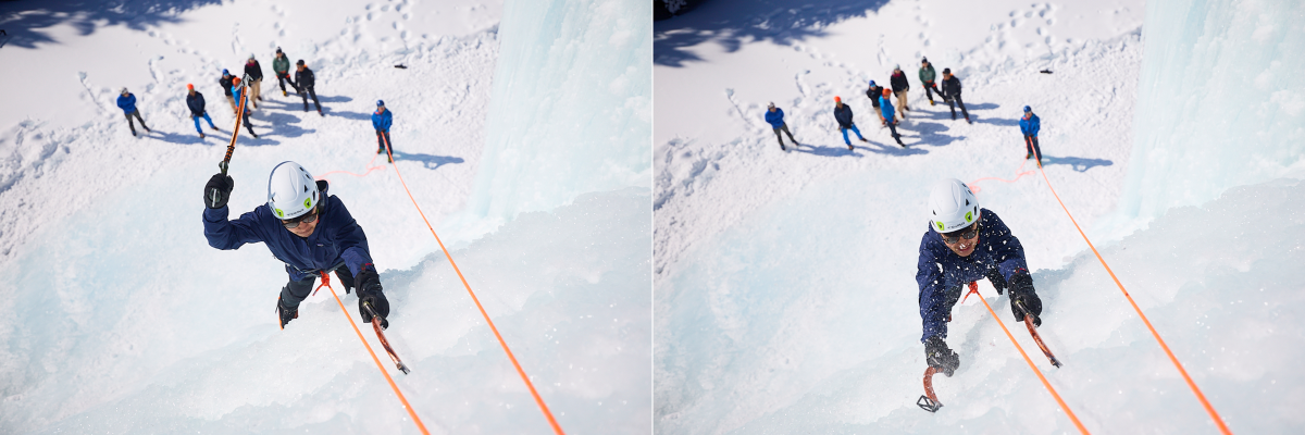 「初心者体験会」なのでアイスクライミング用のギアをはじめて身に着け、人生初の氷壁に挑んでいる人ばかりなのだが、講師陣のサポートを背にグングンと上へ、上へ。