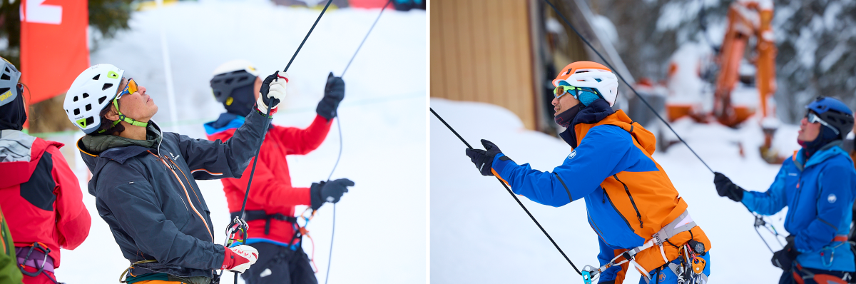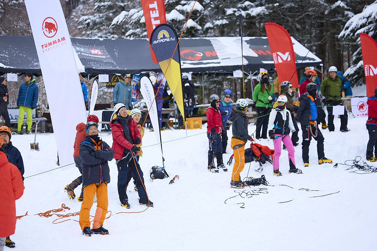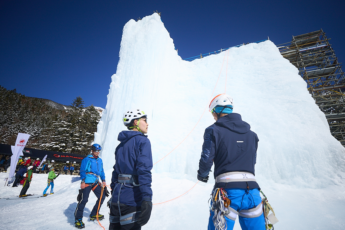 「アイスキャンディフェスティバル2024」では、9つのアウトドアブランドがそれぞれイベントを開催した。そのなかで今回は、アイスクライミングの初心者体験会を行なったマムートチームに加えてもらえることに。