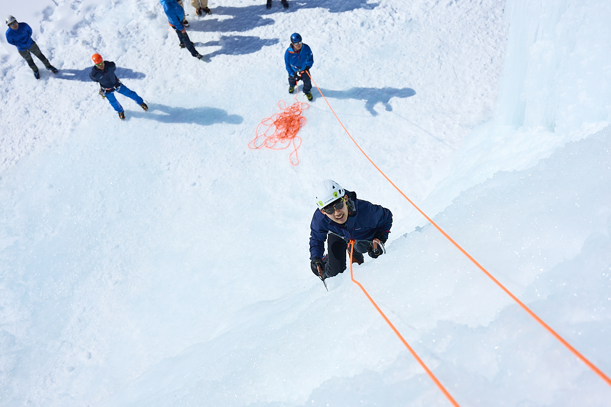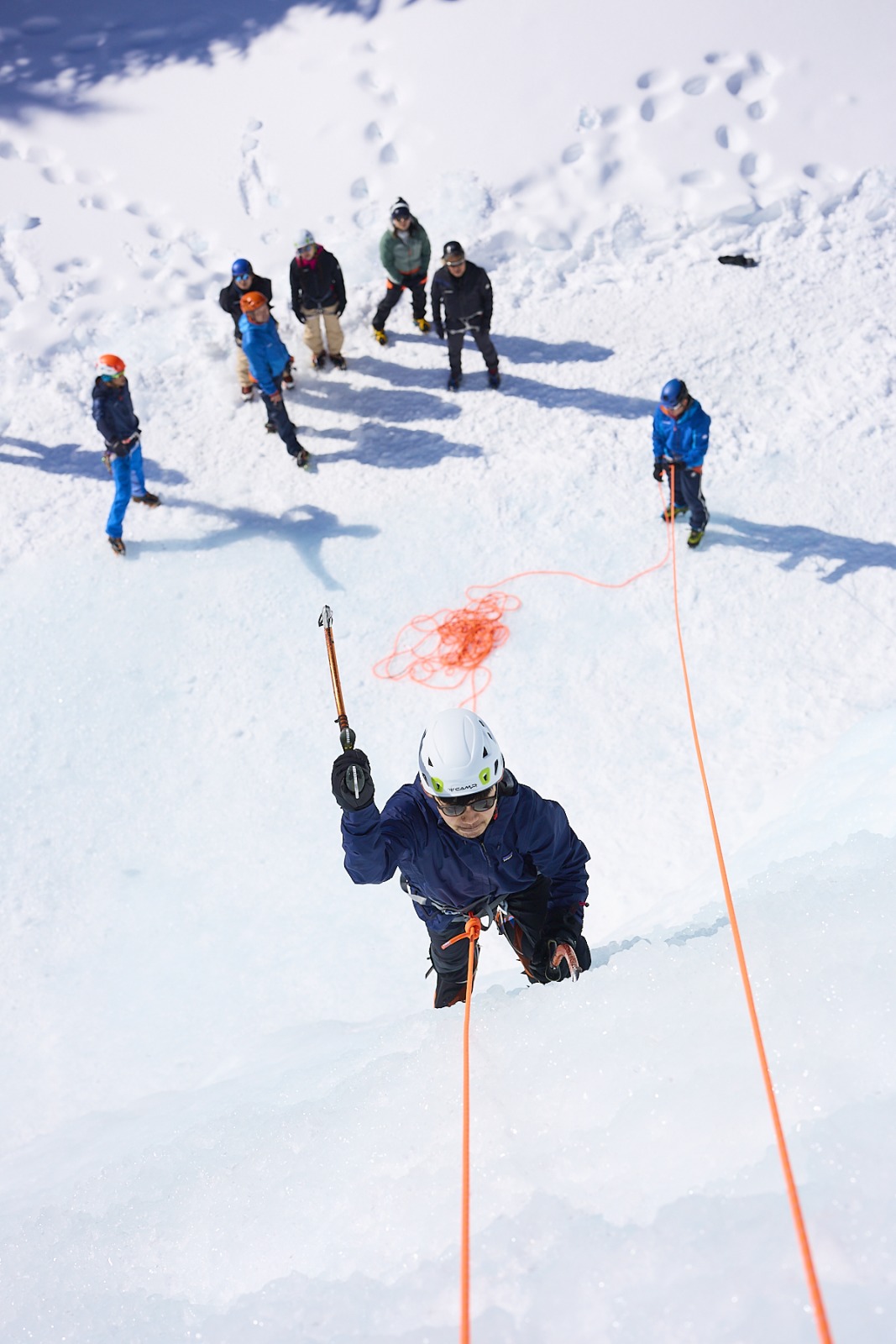 合計で3面あるアイスキャンディのラインに、マムートチームをはじめ各アウトドアメーカーのイベント参加者が順番に登っていく。