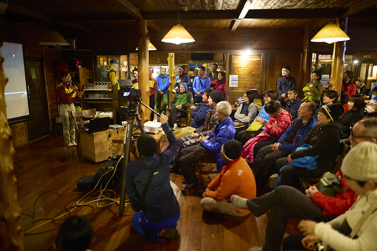 イベント初日の土曜夜、赤岳鉱泉の食堂にて行なわれたのはゲストスピーカー各氏によるトークショー。
