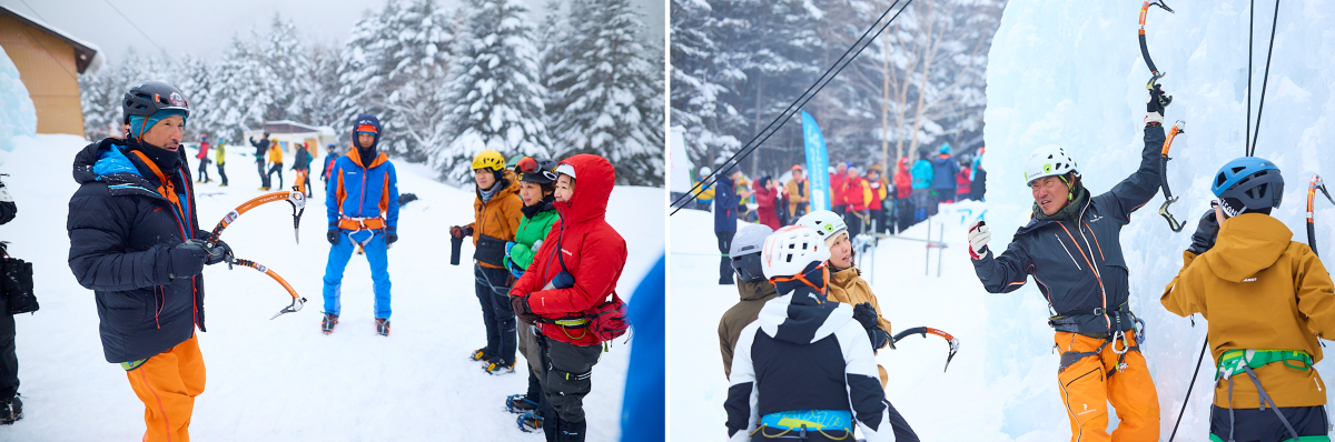 アイスアックスやハーネス、縦爪クランポンなどの登攀に必要なギアは、赤岳鉱泉や出展しているアウトドアブランドからレンタルが可能。さらに、第一線で活躍しているアルパインクライマーや山岳ガイドからなる講師陣が手ほどきしてくれると同時に、安全確保を担うビレイヤーも務めてくれる。