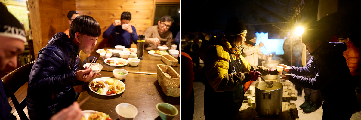 山小屋泊の楽しみは、なんといっても夕食&朝食だ。それに加えてこのイベントでは、夕食後に甘酒・ホットワイン、アクティビティ時間中にBBQ肉、豚汁、コーヒーが振る舞われるなど、コンスタントに美味が提供される。