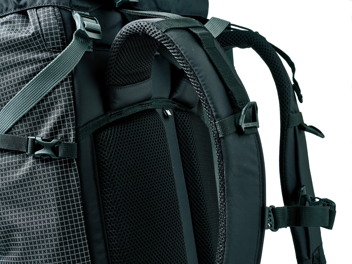テント泊登山にも対応する50+10ℓ。2気室構造でトップスカートを伸ばして最大60ℓまで拡張可。背面は35ℓと同じつくりだが、大容量のこちらはパッドやショルダーをやや厚めに設定。背負ったときの安定感が増し、重荷を背負い慣れない初心者にも優しい。