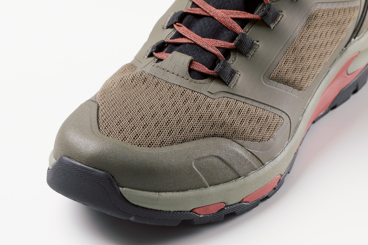 TPU樹脂で補強したつま先はアウトソールから延長したガードでさらに補強。岩などにぶつかったときに衝撃を緩和する。