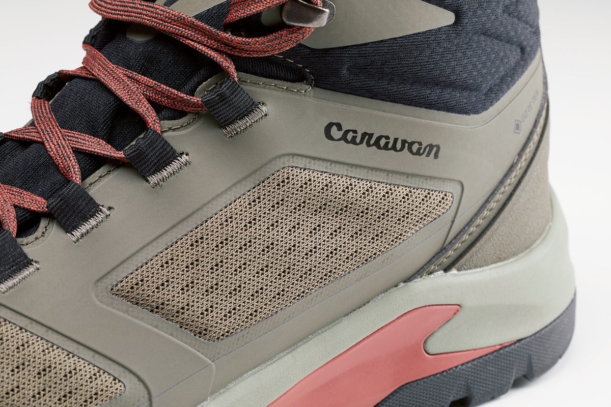 キャラバンのみならず、日本を代表するトレッキングシューズの大定番。幅が広く、ゆとりをもたせた足型や足首周りの柔らかさが特徴で、多くの日本人の足に合うシューズに仕上がっている。