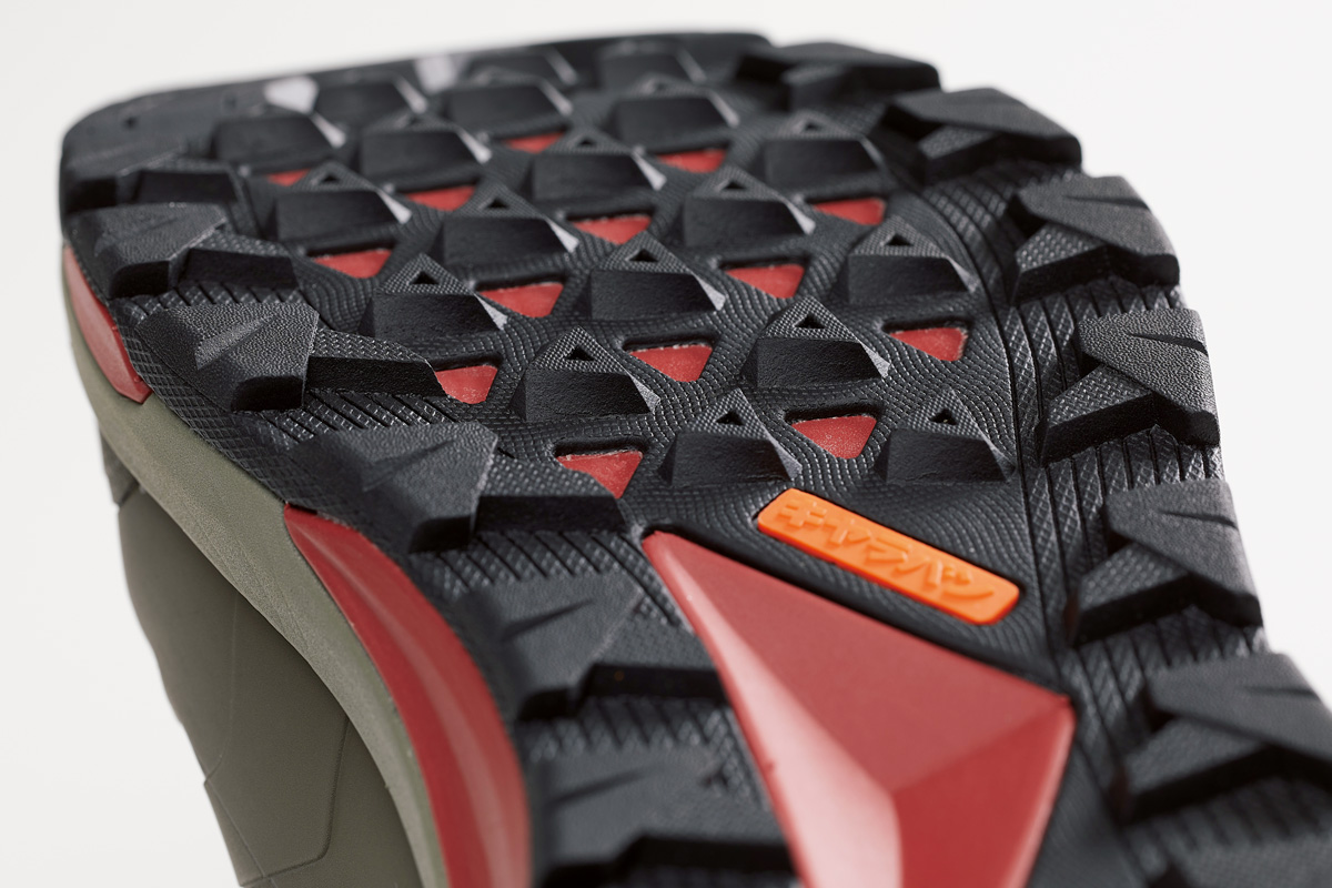 肉抜きを施して柔らかな歩き心地と軽量化を実現したアウトソール。グリップ力は十分に維持してあり、不整地でも安心だ。
