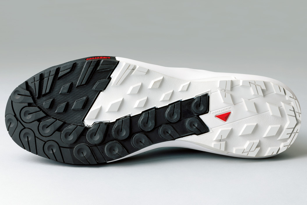 アウトソールにはサロモン史上もっとも粘着性の高いラバーが使用され、さらに4つのラグパターンを使い分けることで機動力や安定性なども生まれるようにバランスを取っている。また、ミッドソールには前足部に硬め、後足部はそれよりソフトな2種類の素材を使用。これにより岩場での安定性と歩行時の衝撃吸収性を両立させた。