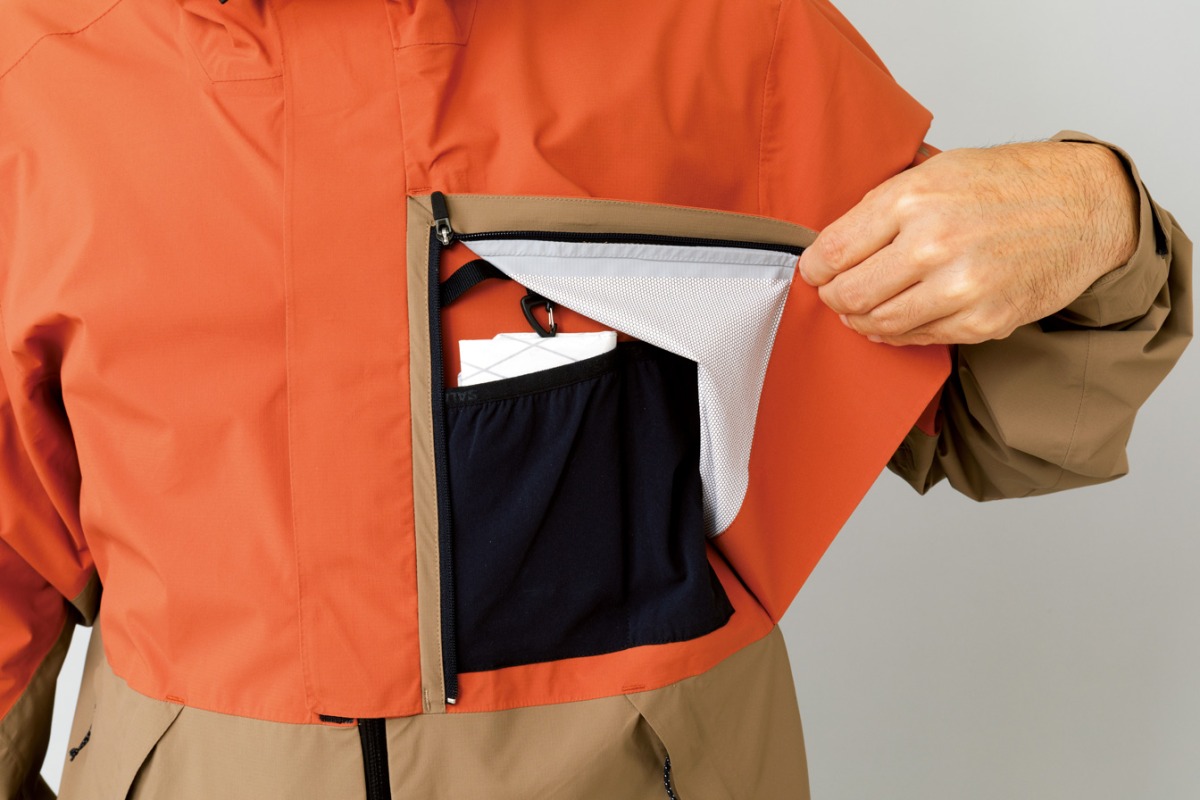 それ以外にも注目したいのは、ジャケットのディテール。のれんのように持ち上げるフラップが付いたポケットが左胸にあり、こちらにはスマホなど細かいものが入れられる。さらに前身頃下部の両サイドに付いているポケットも大型で、ボトルのようなかさばるものも余裕で入る。つまり、ジャケットを着たまま、バックパックも下ろさずに行動しやすいようになっているのだ。使い勝手にもとことんこだわって作られている。