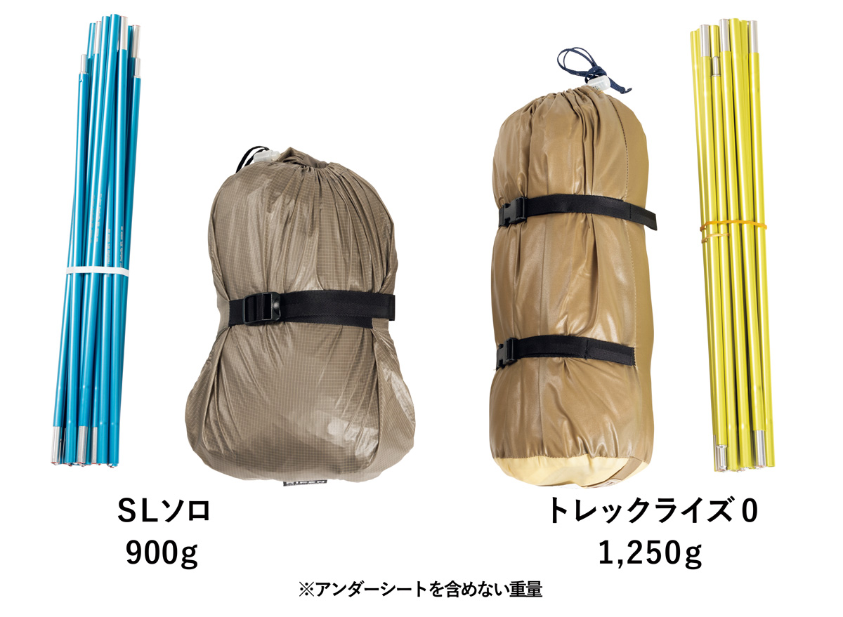 アライテントにおいて居住性の高い軽量3シーズンダブルウォールテントといえばトレックライズであった。“究極の1人用”とされるトレックライズ0と比較しても重量差は350g。圧倒的に軽くなったといえる。