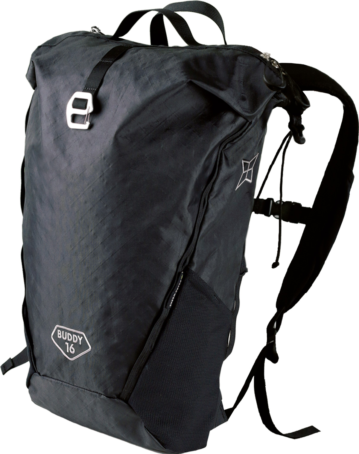 逆台形フォルムが特徴のショルダーポケット付きデイパック。デイハイクからタウンユースまで汎用性が高い。容量はボトルと行動食、着替えなどの収納に十分な16ℓ。