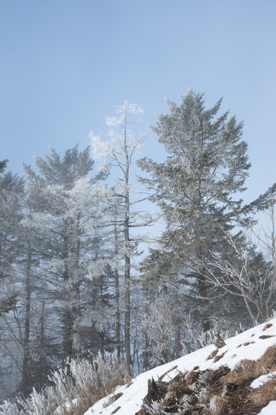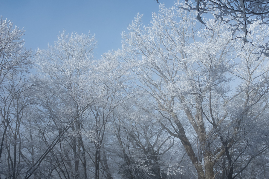 霧がかった空に朧げに太陽が昇り、枝先に伸びた結晶を輝かせている。