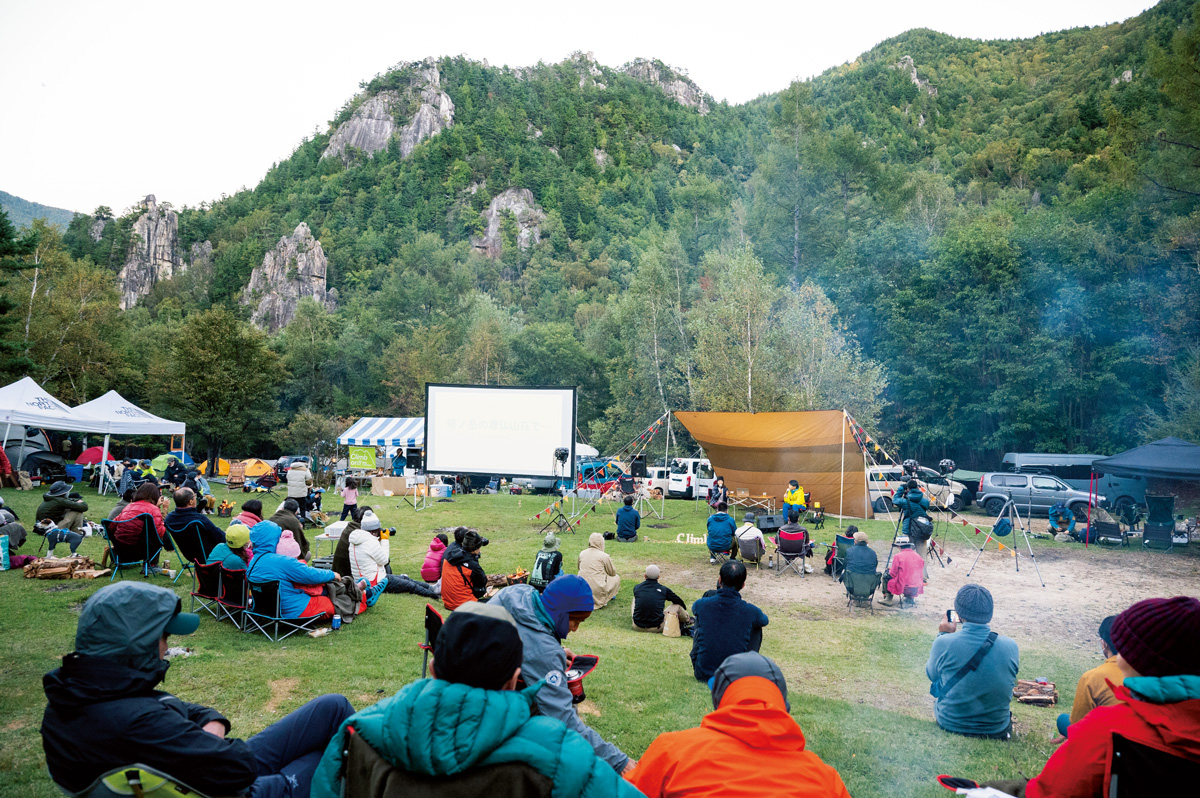 キャンプ場中央のメイン会場では、日中は白熱のボルダリングコンペが開催されるほか、夜にはトークショーや映画を楽しめるナイトパーティーを開催。お酒を片手に焚き火にあたりながら、家族や友人と有意義な時間を過ごせます。