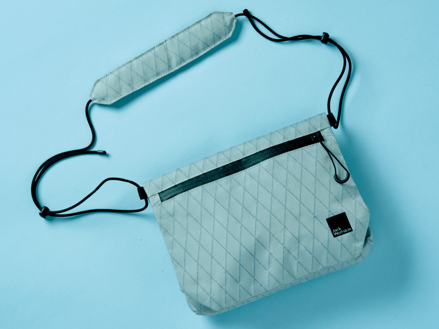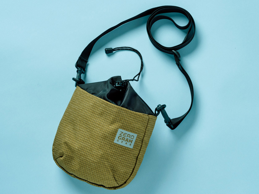 巾着型サコッシュ。開口部はドローコードで絞れ、ポケットは表・裏・内側と3カ所つく。スペクトラとコーデュラを組み合わせた丈夫で撥水性の高い生地を採用。