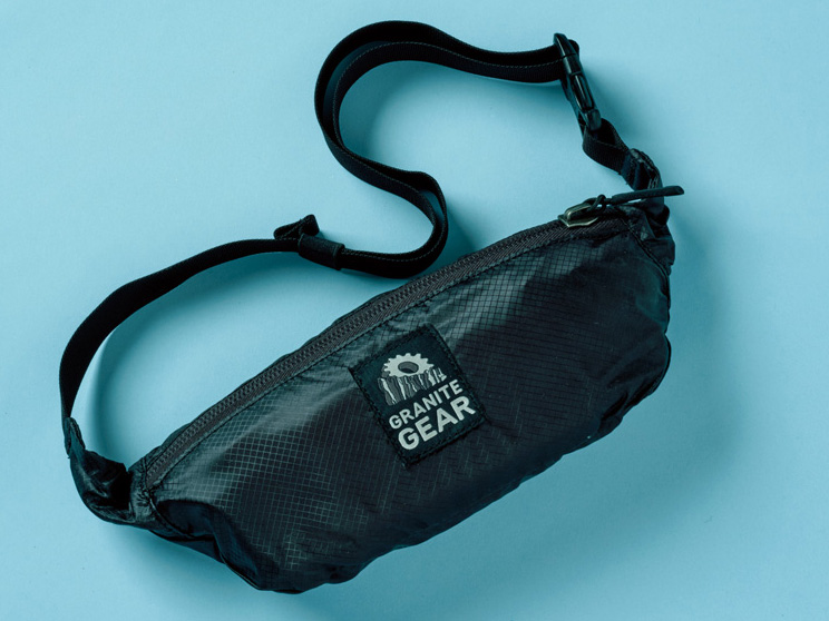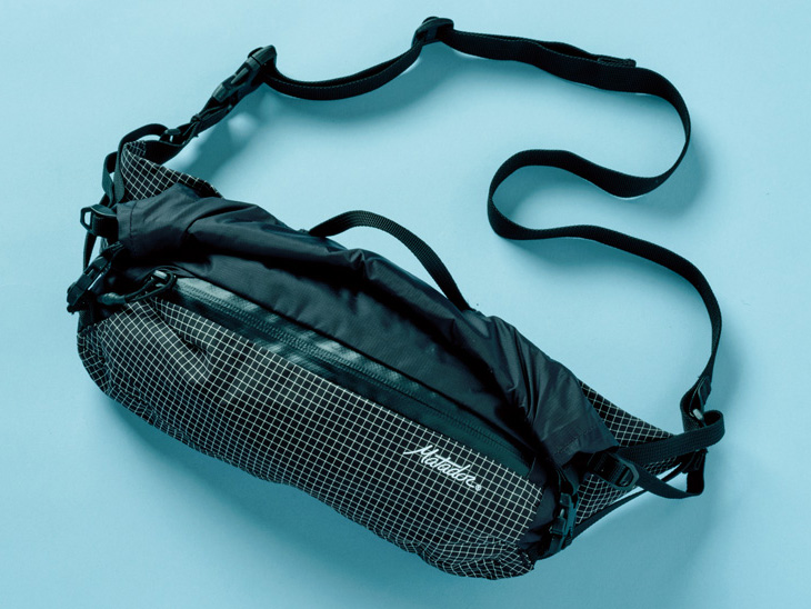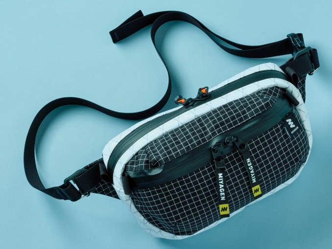 容量1ℓのミニウエストバッグ。ストラップを伸ばして肩掛けもできる。背面にはクッション素材が配置され、接触面の当たりがソフト。フロントのポケットに本体を収納できる。